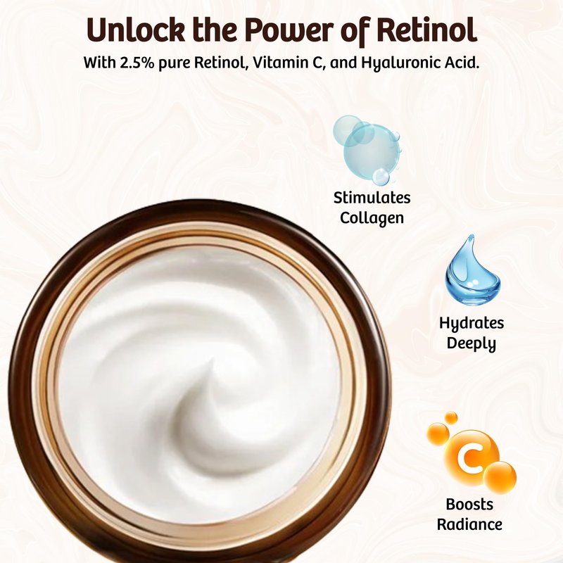 At the heart of our formula is 2.5% pure Retinol, a powerhouse ingredient recognized by experts for its ability to help stimulate collagen production, address fine lines, and revitalize skin texture. Combined with the radiance offered by Vitamin C and the hydrating benefits of Hyaluronic Acid, this product presents a comprehensive approach to skin rejuvenation.