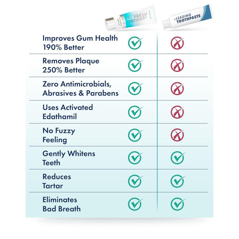 - CLINICALLY PROVEN - LIVFRESH removes plaque 250% better, improves gum health 190% more, reduces tartar, eliminates bad breath, soothes dry mouth, and gently whitens teeth better than leading toothpaste brands. Brushing with LIVFRESH can help you save thousands by improving your oral health and preventing expensive dental procedures.