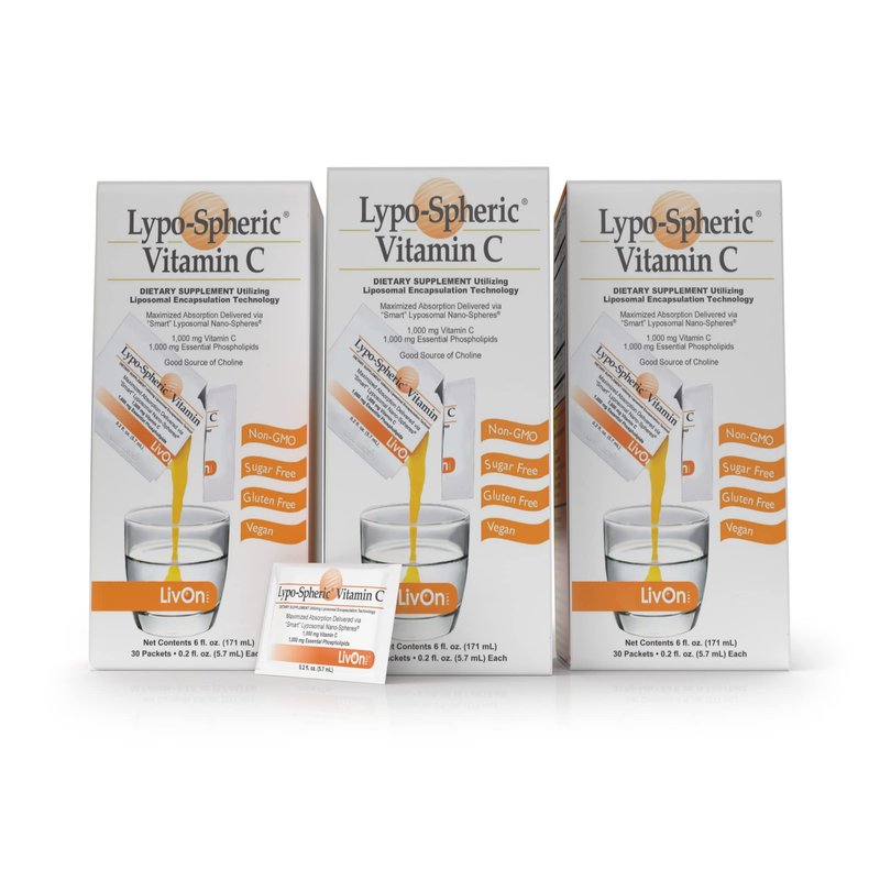 LivOn Laboratories Lypo–Spheric Vitamin C – 3 Cartons (90 Packets) – 1,000 mg Vitamin C & 1,000 mg Essential Phospholipids Per Packet – Liposome Encapsulated for Improved Absorption – 100% Non–GMO