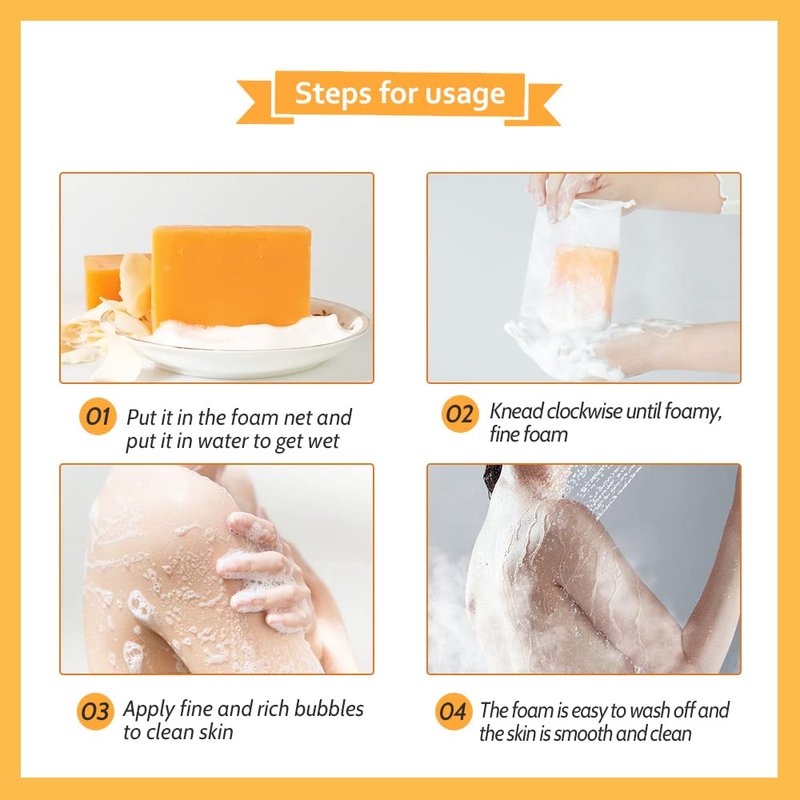 - 🍋How to use:It contains two 140g kojic acid soaps, which are larger and more durable, and give away a soap foaming net . For deeper cleansing, it’s recommended to put the kojic acid soap into the foaming net , wet with water and rub to foam before applying on your body.