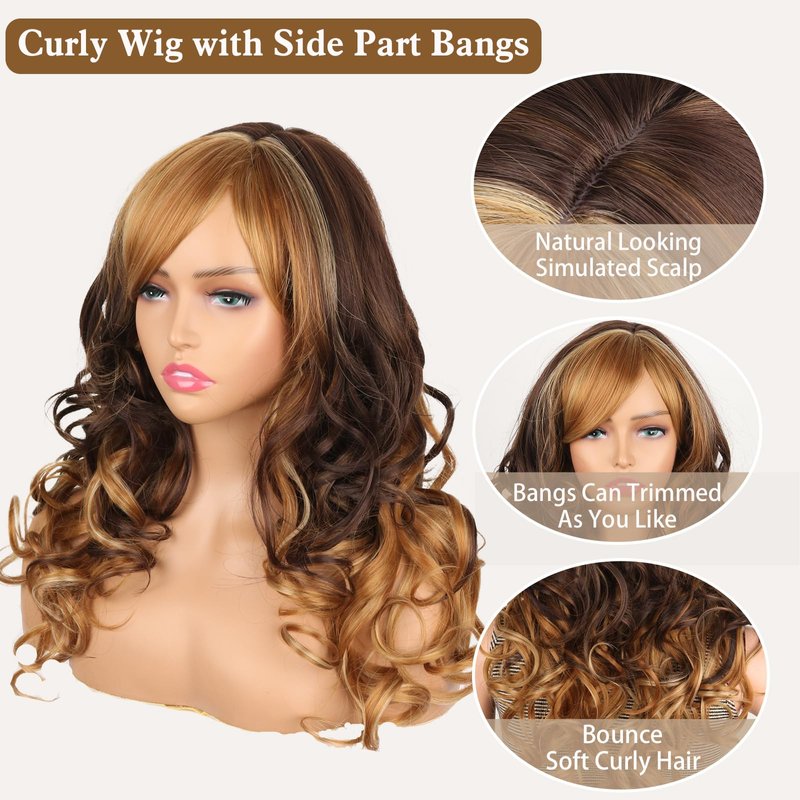 Liyouda Honey Blond Wig Long Curly Honey Blonde Wigs with Bangs for Black Women Wavy Wig with Bangs Highlight Blonde Side Part Wig Glueless Synthetic Wig with Bangs for Women (Mix Honey and Blond Wig)