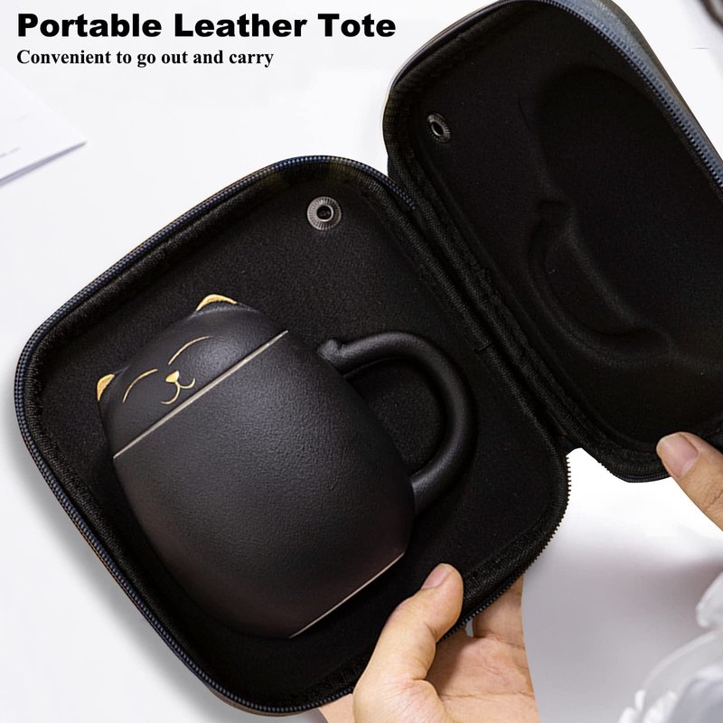 Liywall - Ceramic Tea Mug with Infuser and Lid, Cat Design Handmade Porcelain Tea Cup Strainer With Portable Shockproof Storage Case for Travel Office Home,Wife Girlfriend Gift - Black