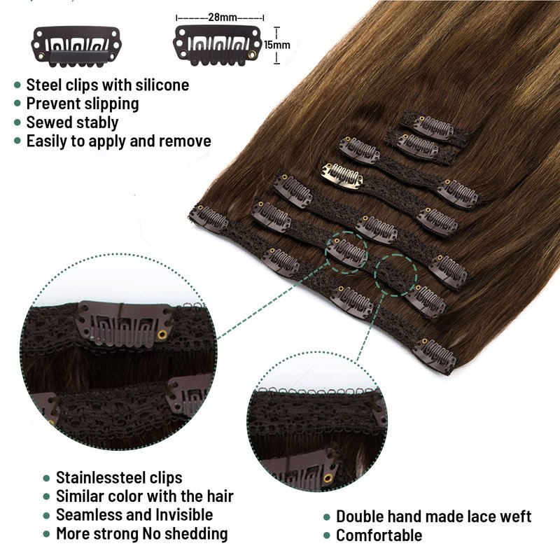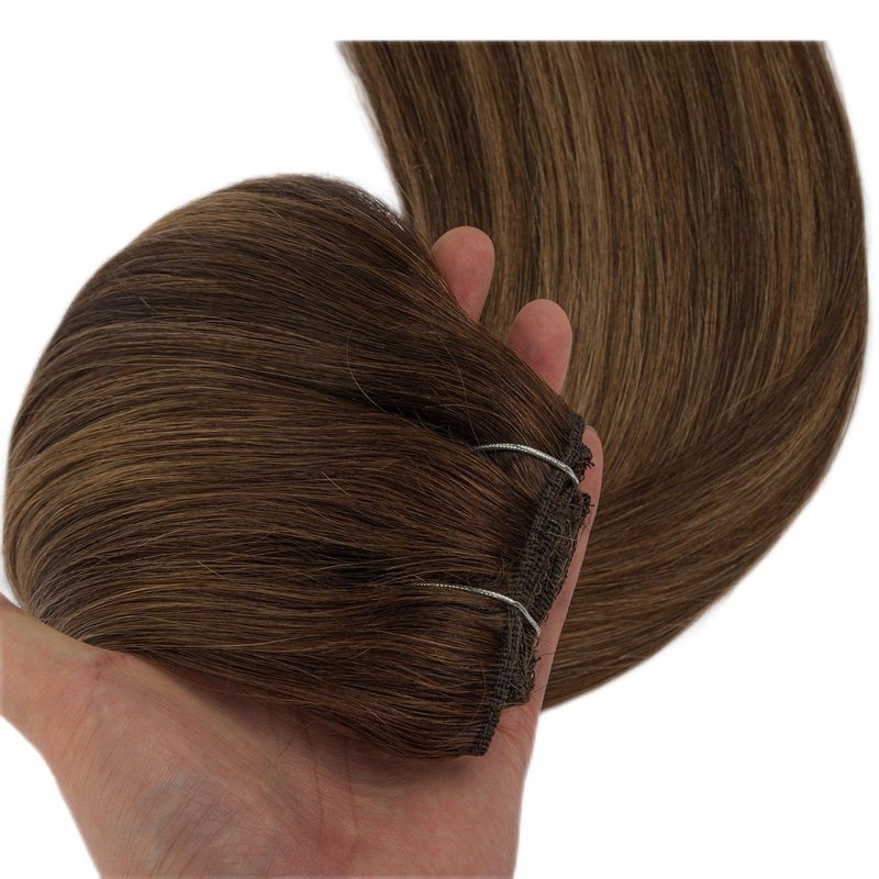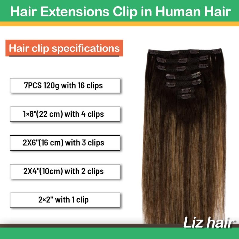 LIZ Hair Extensions, has 10 years experience of producing and supplying high quality human hair extensions at affordable price.We knew your demand, only use the finest 100% Remy Human Hair, long-lasting, comfortable, natural-looking and nicely packaged Clip in hair extensions description Human hair clip in extensions material:100% virgin remy human hair Balayage hair extensions color:S Balayage Chocolate Brown to Caramel Blonde Clip in hair extensions human hair weight:120g. Recommend 1pack for thick hair,2-3 packs for thin hair Clip in hair extensions human hair length:14”- 24” Human hair clip in texture: straight, as thick from top to bottom Real hair clip in extensions quantity:7pcs set 16clips Clip in hair extensions clip size:1.18” Hair extensions clip in human hair lifespan:3-4 months with good care Guarantee: 1.Authentic remy human hair 2.Money back guarantee Easy to put or take out, , can be curled. Our clip in hair extensions can last 3 months with good care, if you use careful, can use more long time,can dye to match your color, restyled, strengthened, curled, dyed, etc. Unlike traditional hair extensions,lace clip hair extensions can fit the scalp better, more comfortable.