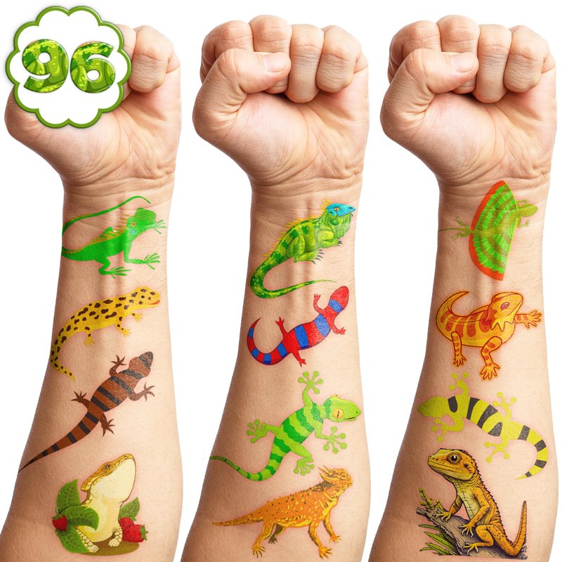 🦎【IDEAL TATTOOS FOR THEMED LIZARD DECOR】: This set of temporary SWAN-themed tattoo stickers comprises 8 sheets in total, featuring a total of 96PCS adorable, distinct designs. They are excellent for distributing as party favors and small gifts with a LIZARD theme for holidays. Each sheet measures 6.1 * 3.1 inches, making them suitable for kids of all sizes. 🎁🦎【FANTASTIC GIFT OPTIONS FOR LIZARD PARTY SUPPLIES AND DECORATIONS】: When you adorn your child's birthday party with a LIZARD theme, you'll be showered with compliments. Don't miss out on giving your kids LIZARD tattoos, as they make for a wonderful small gift. 🌍【SAFE AND ECO-FRIENDLY】: Our temporary tattoos are crafted from materials that prioritize safety and environmental consciousness. These tattoos are made using paper that is both safe for users and gentle on the planet. 🥳【INJECT SOME FUN】: Fed up with ordinary gifts? We've got just the thing! Our assortment of charming and lively temporary tattoo designs can be affixed to laptops, backpacks, desks, suitcases, books, water bottles, and beyond. These whimsical touches are bound to enhance your visual surroundings and infuse a bit of happiness into your daily essentials. 🌴【SIMPLE APPLICATION AND REMOVAL】: Simply cut out each tattoo from the sheets and peel off the clear film. You can apply it to your hands, face, arms, or any area you feel comfortable. Additionally, you can place it on glasses, clothing, or a smooth flat surface. Afterward, thoroughly wet it with water and wait for 20-30 seconds before removing the backing paper. Voilà, you now have a smooth, velvety tattoo! 👍【EXCELLENT CUSTOMER SERVICE】: Should you encounter any challenges while using our product, don't hesitate to reach out to us. We are committed to resolving any issues and ensuring you have an exceptional shopping experience
