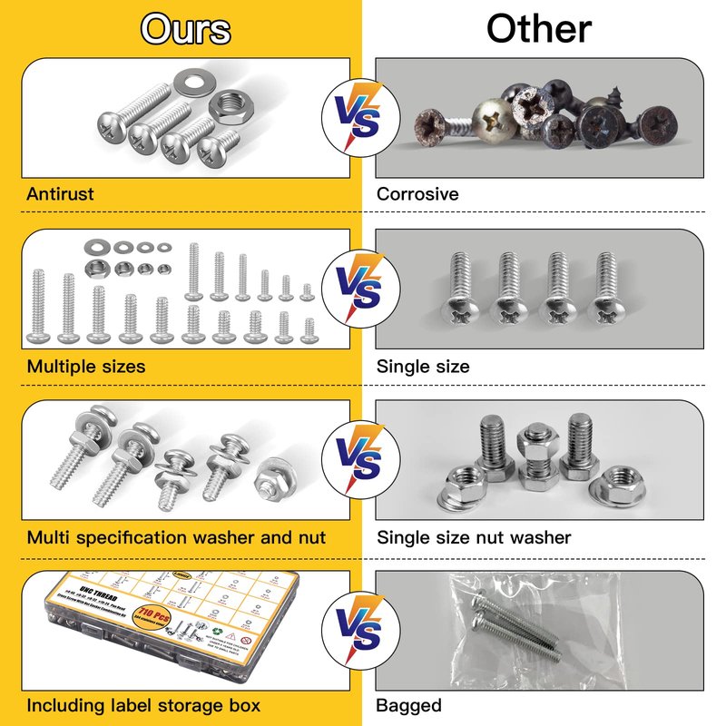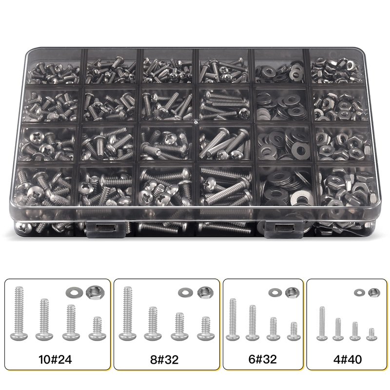 - 【Multiple Sae Sizes】--- Nuts and bolts kit has a full range of specifications, Flat washers and nuts in #4, 6, 8, and 10 size with ample quantities to last.Different sizes can meet your different needs.