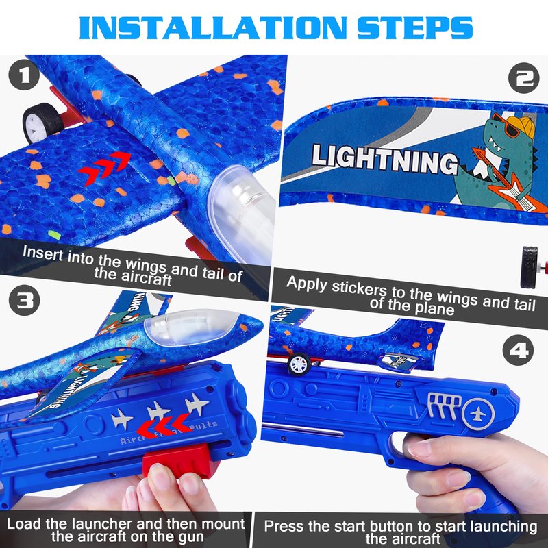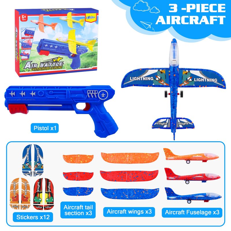 - 3 Fun Ways To Play - Foam glider-led plans can not only use the airplane launcher to achieve flight, but also can be thrown airplane toys into the sky and ground manually, or slid by hand boys toys. This plane brings endless fun to children, and outdoor toys and more novel ways to play are waiting for you to discover! In addition, glider planes for kids have no restrictions on the launch site, you can play indoors and outdoors!