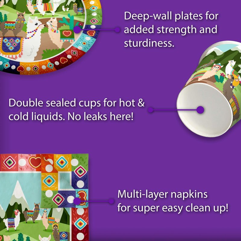 - PREMIUM DESIGN – Our Llama Party Supplies are suitable for girl’s and boy’s birthday parties, holiday celebrations with your family and friends, special events or for just fun-filled daily meals, snacks, and desserts with picnics and cookouts. Shrieks of joy will be your reward when you use these fun and unique party tableware sets.