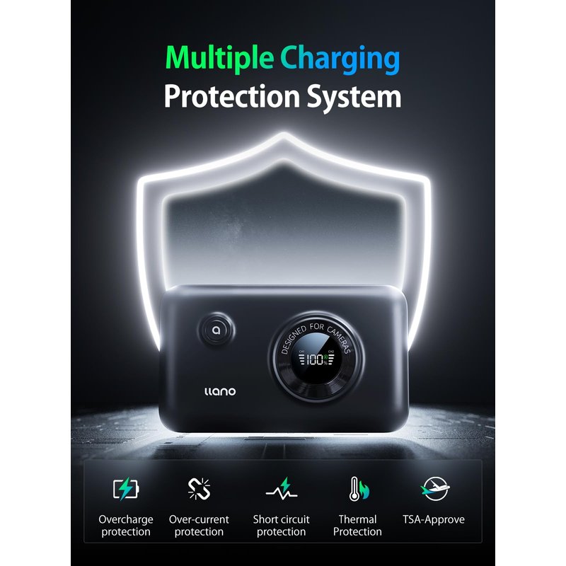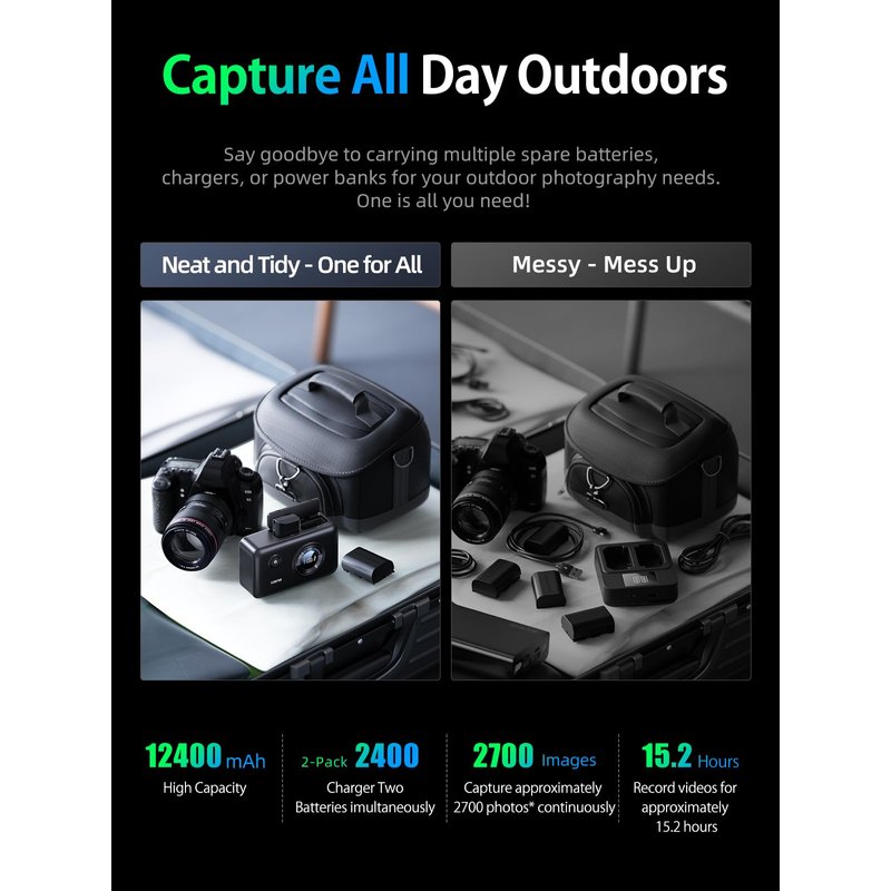 - Ultimate Protection – 10-Layer Safety System: Stay worry-free with comprehensive safety features, including thermal regulation, short-circuit prevention, overcharge protection, and intelligent voltage control. Whether you're on a long outdoor shoot or in a professional studio, this robust 12400mAh battery pack ensures consistent and reliable performance every time