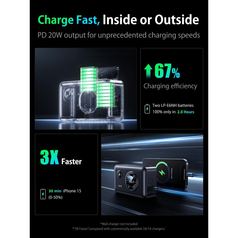 - Hyper-Fast Charging – 67% Faster with QC3.0 & PD3.0:Equipped with advanced QC3.0 and PD3.0 technology, this charger delivers 67% faster charging than standard models. Simultaneous Pass-Through Charging – Charge your camera batteries while the power bank itself is recharging. Lightning-Fast Power-Up – Fully charge two LP-E6NH batteries in just 2.5 hours, minimizing downtime and maximizing productivity
