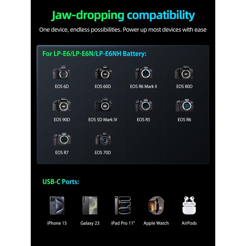 - Premium Design & Broad Compatibility:Precision-engineered for Canon users, this charger supports LP-E6NH, LP-E6N, and LP-E6 batteries, making it compatible with a wide range of Canon cameras, including: EOS R, R5, R6, 5D Mark IV, 6D Mark II, 7D Mark II, 80D, and 90DVersatile Power Hub – Also compatible with iPhone 15, iPad, Galaxy S23, and more, ensuring all your tech stays ready when you need it most. (Note: Battery not included.)