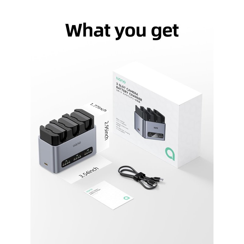 Crafted from CNC-machined aluminum, the 3-pack battery charger draws heat away from charging circuits 40% faster than plastic housings, keeping batteries cooler for safer fast charging. It comes with 3 new USB-C Input batteries, an instruction booklet, a lanyard cord and a CNC aluminum 3-slot charger.