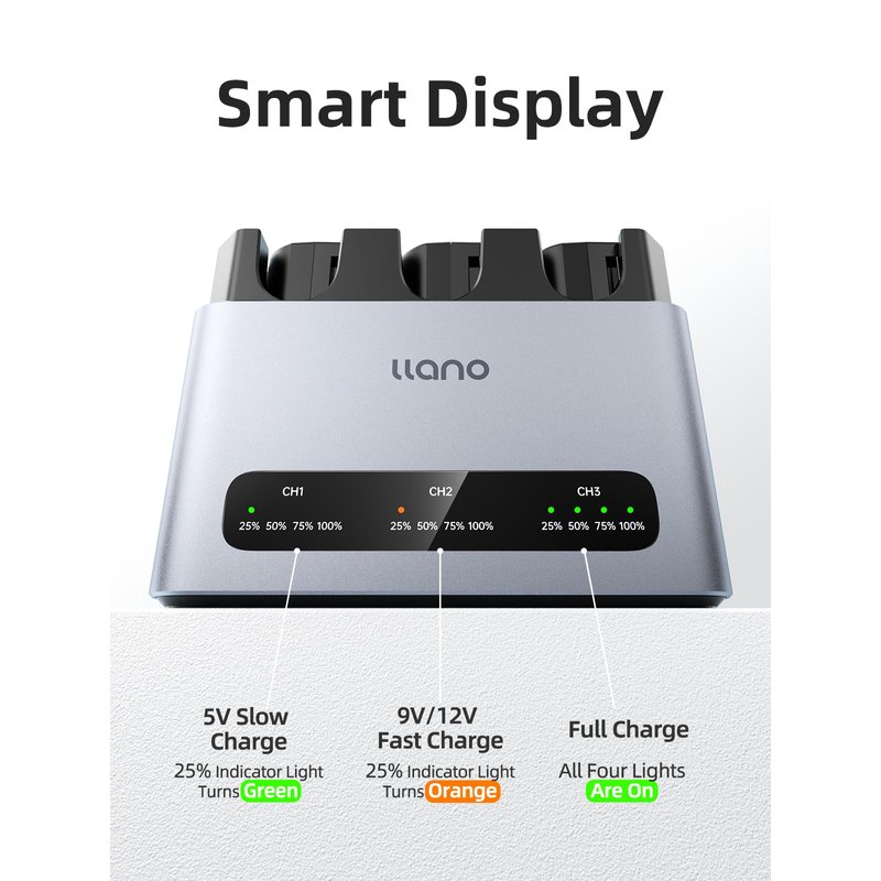 - Smart LED Charge Tracking: Each slot features a 4-stage LED indicator (25%/50%/75%/100%) that glows in real-time, so you always know exactly when batteries are shoot-ready. No more guessing—just grab and go when any light hits solid green
