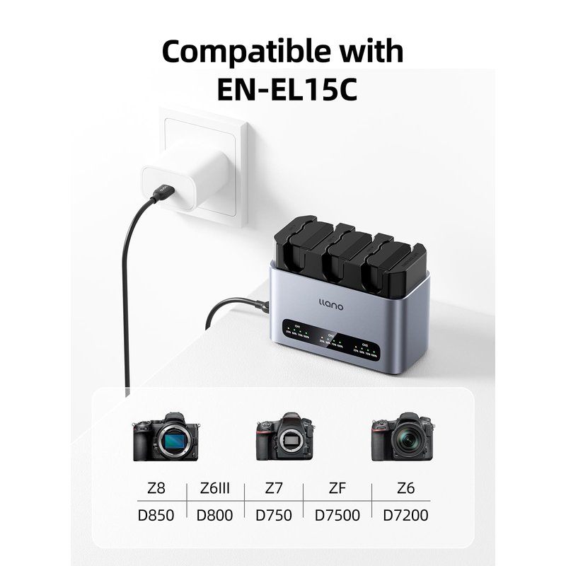 - Sleek, Versatile Design with Flawless Compatibility: Elevate your photography with the llano EN-EL15C Battery Charger Set, meticulously engineered for Nikon Z8, D850, Z7II, Zf, Z6III, Z7, Z6II, Z6, D810A, D780, D7500, D500, D800, D810, D7100, D7200, D600, D610, D750, and many other models. Whether you're shooting landscapes, portraits, or vlogging, this charger is a perfect companion for your camera (Compatibility Note: The EN-EL15C battery is fully backward compatible with EN-EL15a and EN-EL15b batteries)
