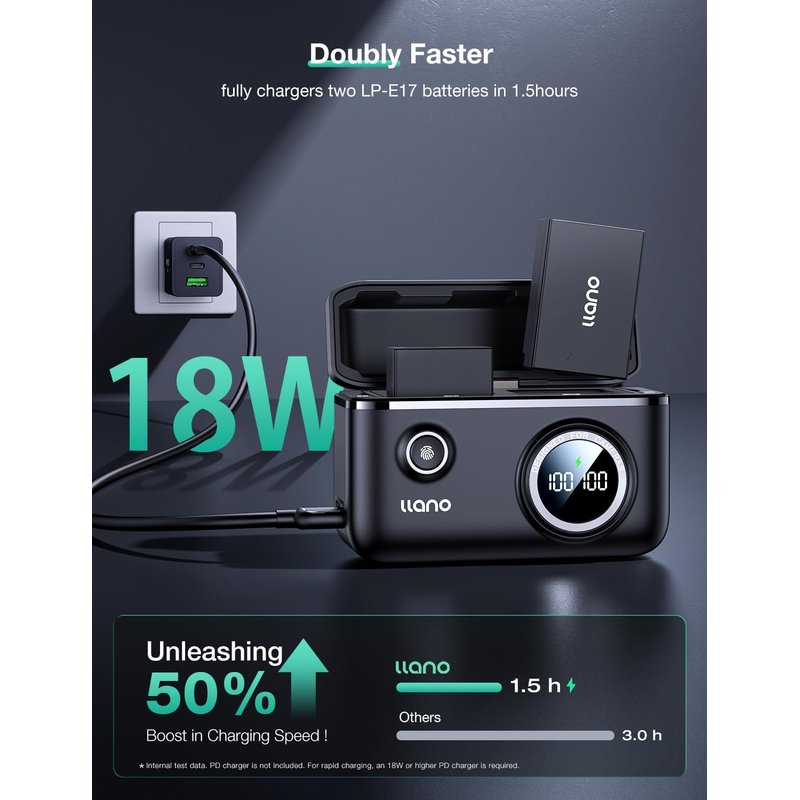 - SWIFT, SEAMLESS CHARGING: Embrace lightning-fast charging with llano camera battery charger 18W QC3.0 and PD3.0 technology-charged lp-e17 charger, elevating your photography game with 50% faster speeds than conventional chargers.