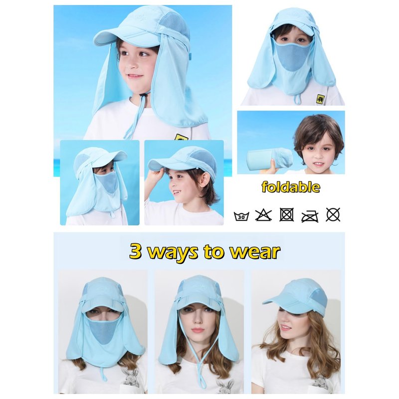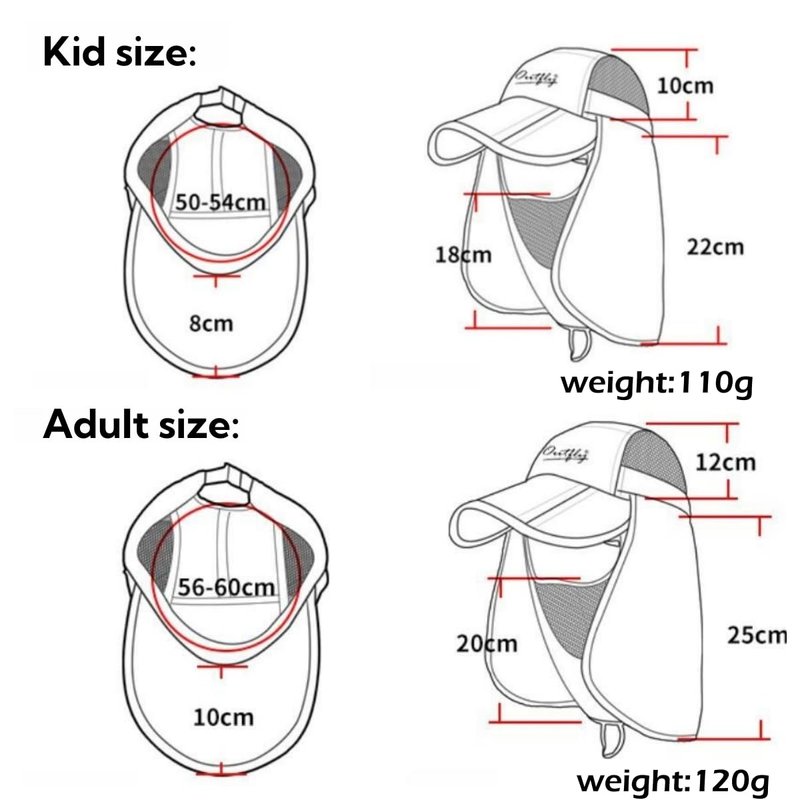 - Sun protection: quick dry cap with foldable long bill, 8cm for kid, 10cm for adult; detachable neck flap, 22cm for kid, 26cm for adult; detachable face mask, 18cm length for kid, 20cm length for adult; 360°protect the face neck skin from the UVA, UVB, UPF50+, super UV protection