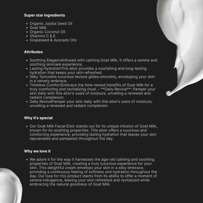 - 🌿 NOURISHING TRANQUILITY: Indulge your senses with the indulgent experience of this Goat Milk Facial Elixir as it works to calm and soothe skin for a look of pure tranquility.