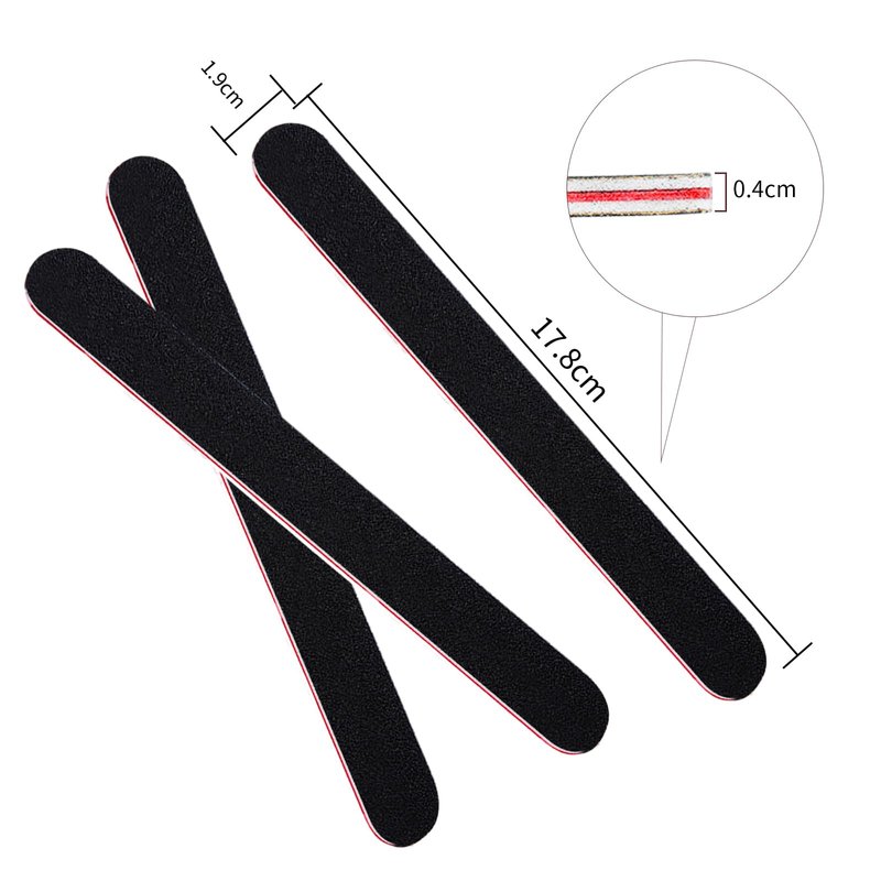 - The size of the nail file is 7*0.79 inch, black nail file is 0.15 inches thickness, brownish red nail file is 0.07 inches thickness.