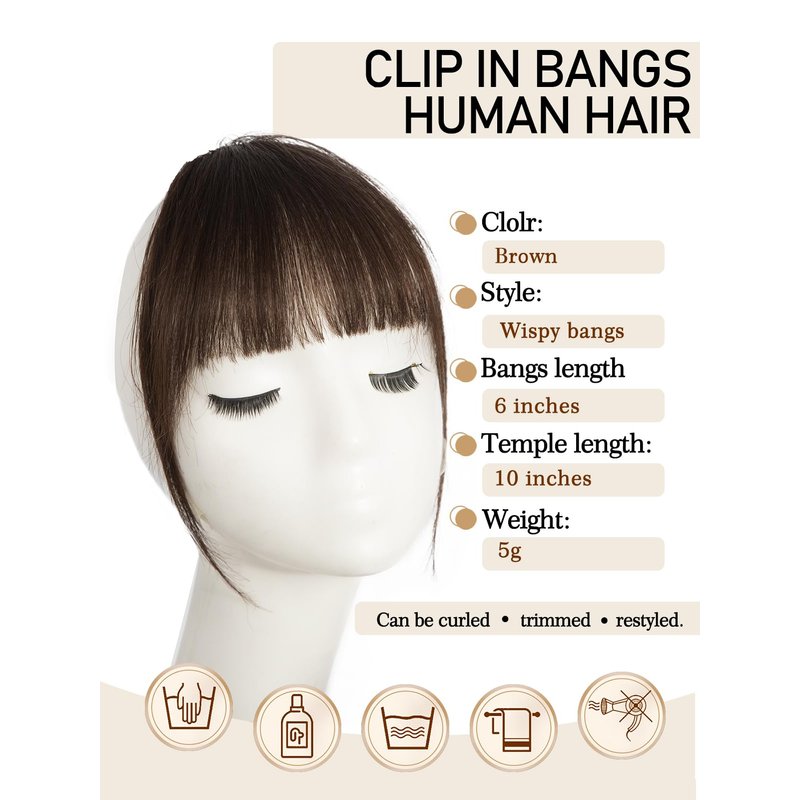 - ð¹ãHigh Quality Materialã100% human hair clip in bangs create the most shiny and authentic natural effect, soft and smooth, just like your own hair. Human hair bangs can be styled using a curling iron or a straightener. It can be trimmed, curled, straightened or dyed to your liking. You are free to change their shape according to your preference and needs. Perfect for dates, parties and daily use.