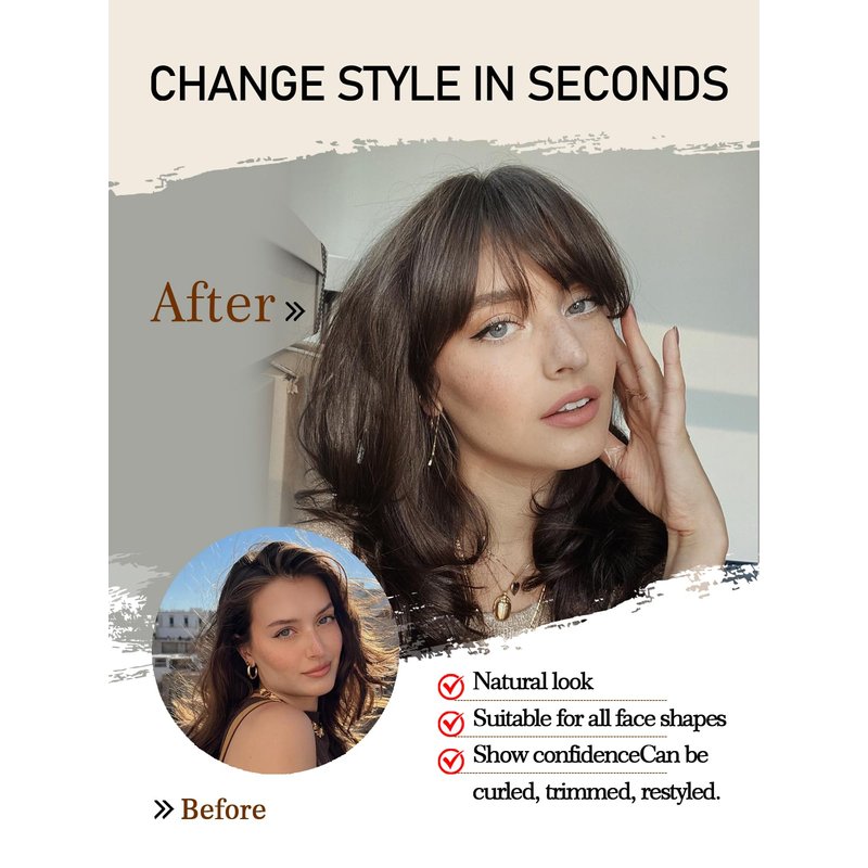 - ð¹ãMore Color OptionsãWe offer a variety of bangs extension color options, you can choose the one closest to your hair color. However, please note that actual product color may vary slightly from imaged due to differences in photography equipment, lighting conditions, and monitor color variations. If the color of the product you receive does not meet your expectations, please don't worry, we provide unconditional returns and exchanges to ensure your satisfaction.