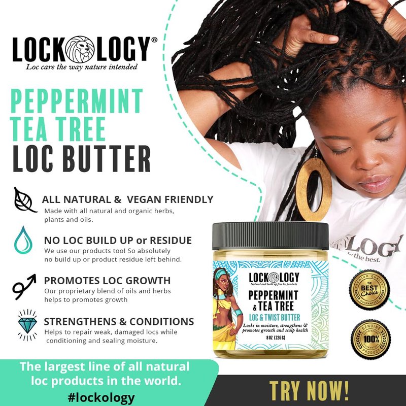 Lockology Peppermint and Tea Tree Dreadlocks Butter (All Natural – Promotes Growth Relieves Itching) Lockology Peppermint and Tea Tree Loc Butter is a unique blend of peppermint, green tea and other all natural ingredients to strengthen your locs and promote growth. This blend also conditions your scalp and relieves itching. * Made With All Natural Ingredients in the USA * NO Build-up – Will not build-up on your locs! * Tames Frizz – Holds fly aways in place longer * Lasting Hold – Holds your palm rolls, twists and curls in place longer * Aromatherapy – Calms, soothes and relaxes the mind * Promotes Growth – Using only natures growth serums * Moisturizes and Conditions – Absorbs into your locs keeping them soft and silky * Strengthens and Protects – Rich in protein and other nutrients to strengthen * Nutrient Rich – Vitamins A, B1, B2, B5 (Panthothenic acid), D, E, minerals, protein and lecithin Ingredients: Coconut Oil, Castor Oil, Avocado Oil, Sweet Almond Oil, Green Tea Extract, Hibiscus Extract, Neem, Beeswax (No Build-up Guaranteed), Peppermint Essential Oil and Lockology Loc Essential Oil Blend and Vitamin E.