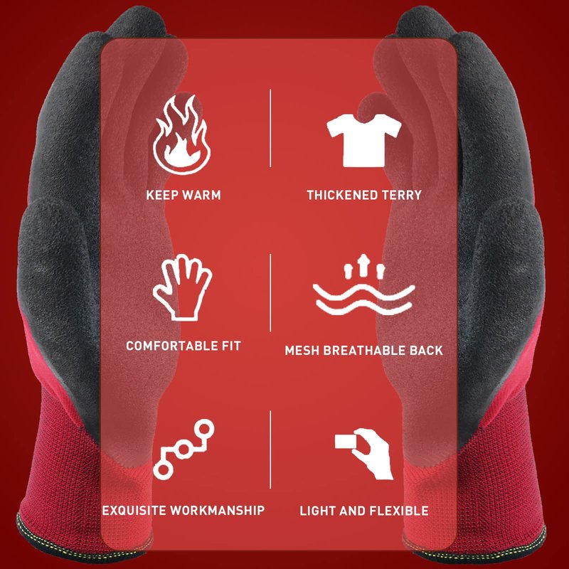 - HIGH-QUALITY WORK GLOVES -- This winter work glove with a red polyester lining,excellent anti-slip performance, oil resistance, and durability. The unique two-layer coating that prevents liquids from seeping into the gloves and contact with the hand, unaffected by oil and water environments.