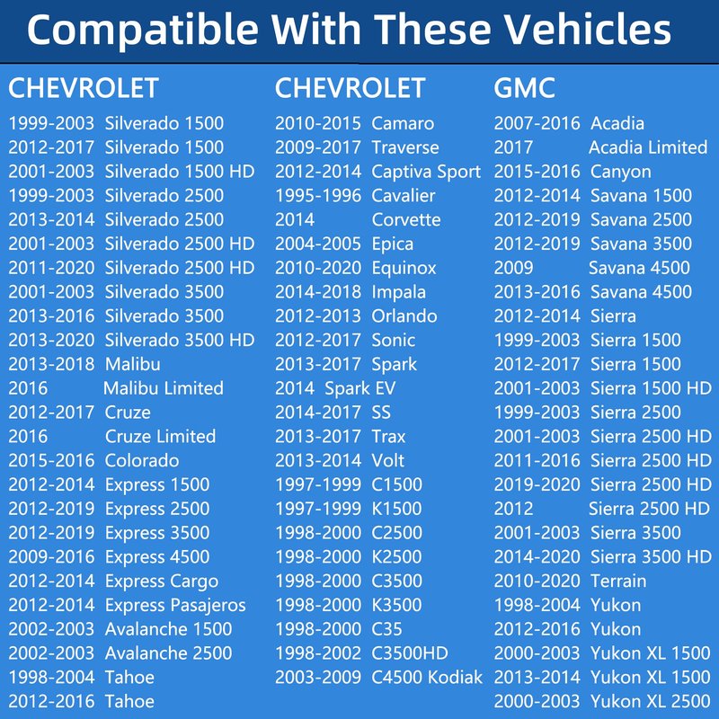 - 【COMPATIBLE WITH CHEVY】99-03,12-17 Silverado 1500 | 01-03 Silverado 1500 HD | 99-03,13-14 Silverado 2500 | 01-03,11-20 Silverado 2500 HD | 01-03,13-16 Silverado 3500 | 13-20 Silverado 3500 HD | 13-18 Malibu | 12-17 Cruze | 2015-16 Colorado | 12-14 Express 1500 | 12-19 Express 2500 3500 | 09-16 Express 4500 | 12-14 Express Cargo/ Pasajeros | 2002-2003 Avalanche 1500/2500 | 98-04,12-16 Tahoe | 10-15 Camaro | 14-16 Suburban | 98-03,12-13 Suburban 1500 | 2000-03 Suburban 2500 | 2017 Suburban 3500 HD