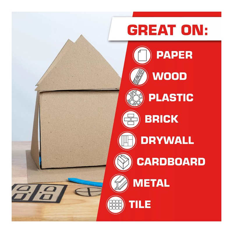 - Versatile: Sticks to paper, wood, tile, linoleum, cinderblock, brick, metal, plastic, mirrors, and glass