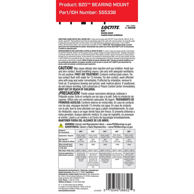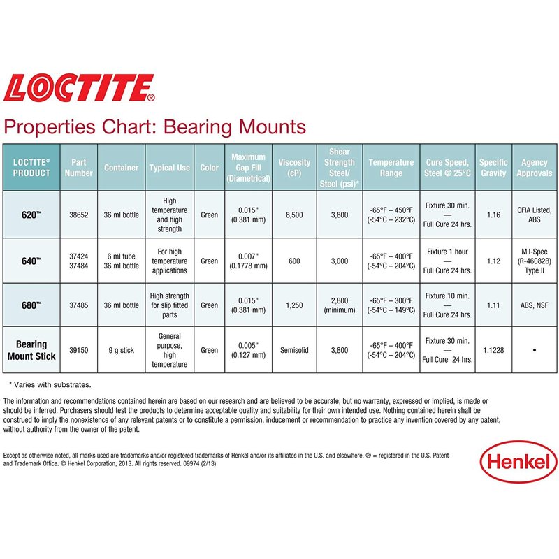 Loctite 620 High-Temperature Bearing Mount Retaining Compound: High Viscosity, Seals Against Leakage, High-Strength, Locks and Secures Cylindrical Assembliesl| 36 ml, Bottle (PN: 555338)