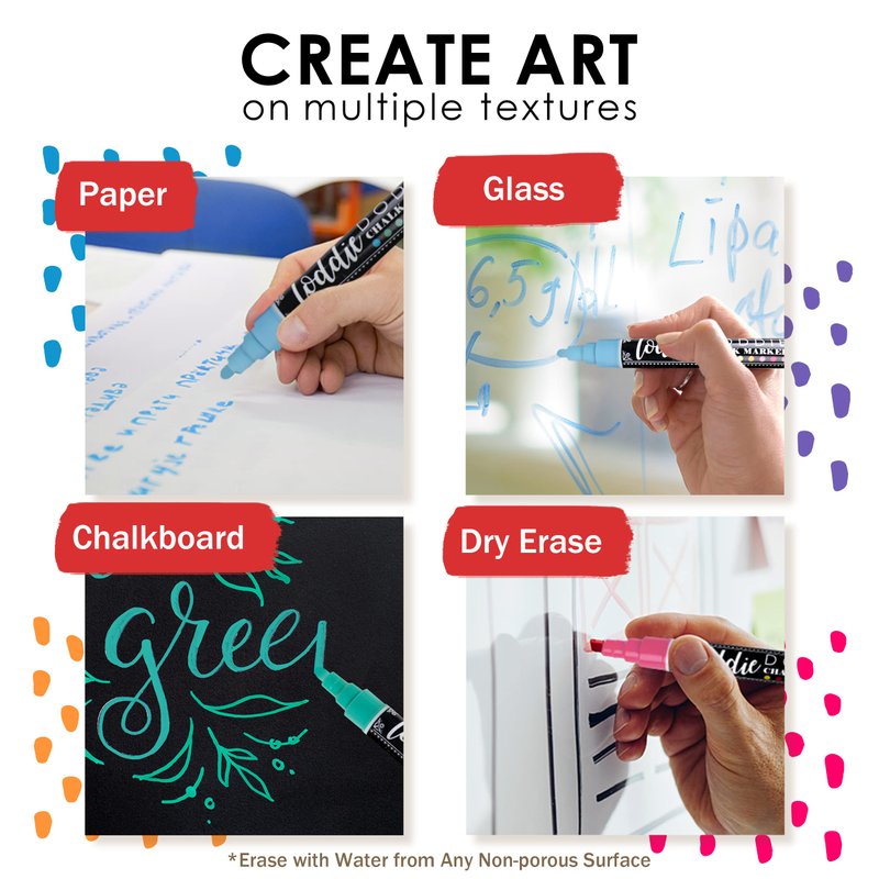 - LIQUID CHALK MARKERS ERASABLE- These markers can be used on any non-porous surface and easily erased with water. Perfect for adding a fun flair to your storefront or create an eye-catching display.