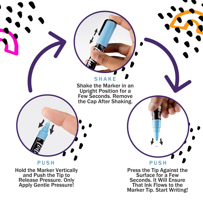 These versatile markers are perfect for everything from school projects to home décor. Chalkboard marker come in various colors, allowing your creativity to shine. They're also incredibly easy to use – shake them up and start drawing! And when you're finished, the ink is smudge-proof and has a low odor, so it's perfect for indoor use. Cleanup is a breeze, too – wipe away with a damp cloth. Whether you want fine line markings for accuracy and precision or something a little broader and more expressive, we've got the perfect erasable chalk markers. Our thin chalk markers fine tip are not only a lot of fun and simple to use, but they also give every sketch or message a distinctive style. With a 6mm reversible tip that can create bullet point and chisel point markings, these fine point chalk markers are perfect for everything from labeling products to creating eye-catching displays. Whether you're a professional artist or just starting your creative endeavors, these chalk markers for glass will make your work pop with bright, beautiful colors. From deep, rich hues to light and airy pastels, we have the perfect shade to match your project. With just a simple wipe of water, you can erase them from any non-porous surface - so they're perfect for everything from creative projects to busy offices. You can choose the ideal one for your needs from various colors and sizes. The fine point markers are great for adding small details and embellishments, while the jumbo 15mm markers are perfect for making big statements. So whether you're looking to brighten your home or office or add fun to your everyday life, our chalk markers are sure to please. HOW TO USE: 1. Push: Hold the chalkboard pen vertically for the first time. Press the tip slightly to release the pressure. 2. Shake: Shake well with the Cap on while in the upright position. Remove Cap before use. 3. Push: Press the tip for a few seconds until the tip fills with ink. Recap after use and store at room temperature.