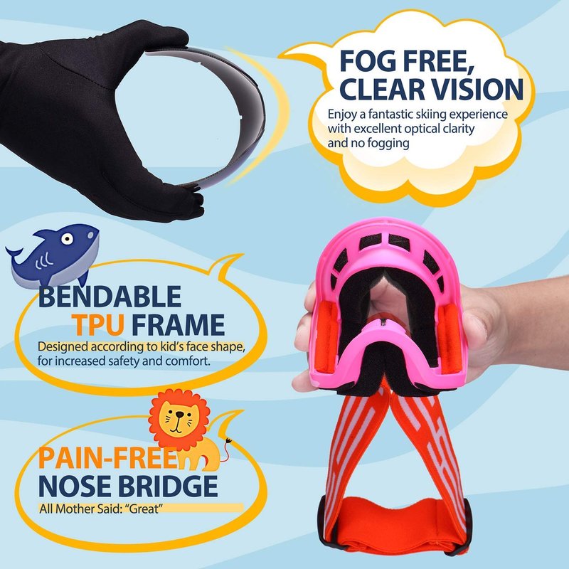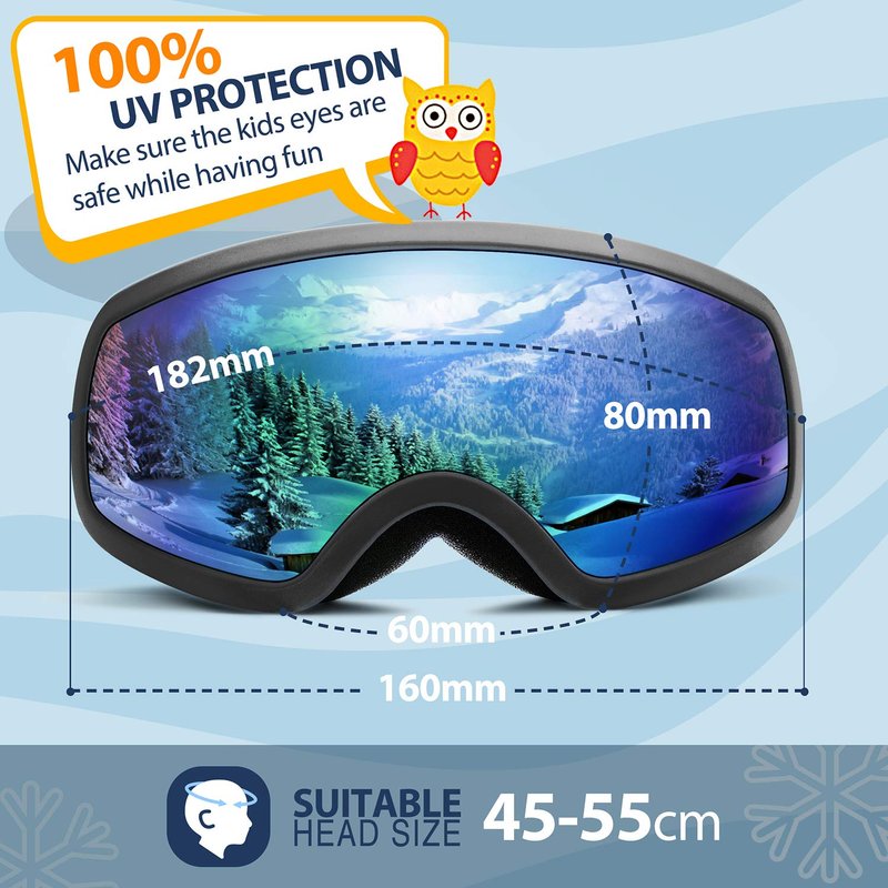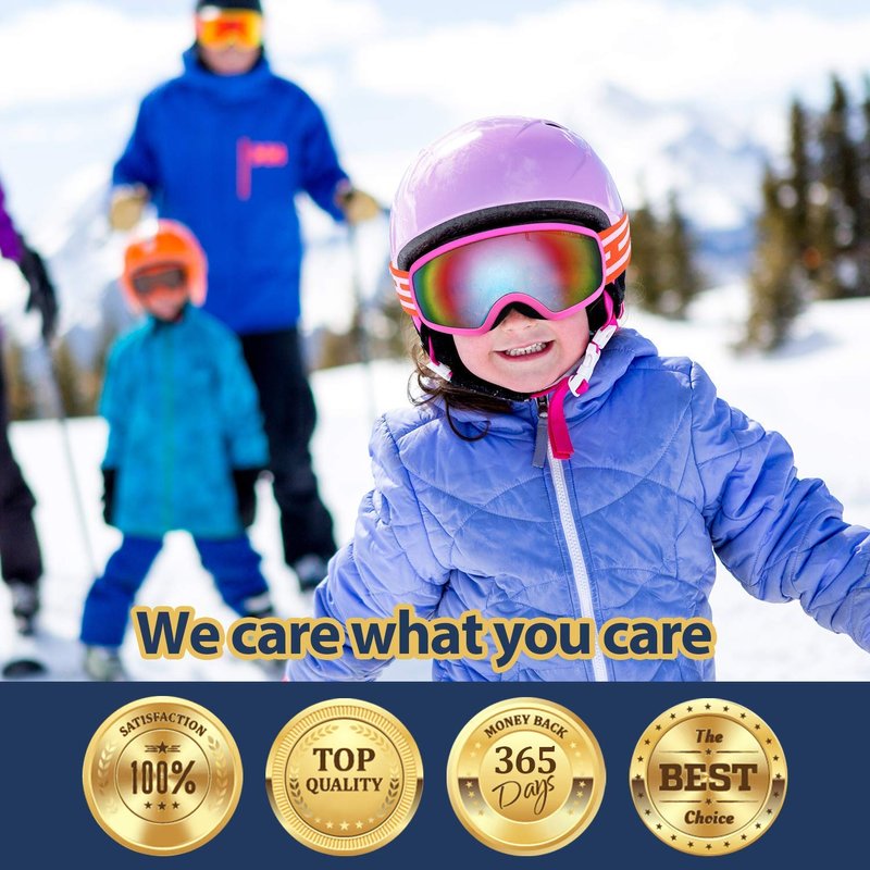 - 100% UV Protection: 100% ANTI-UV lens on all ski goggles lenses. Tinted lens to protect the eyes from the sun, Increased depth of field and reduced glare. Let your kid have full funny enjoy skiing.