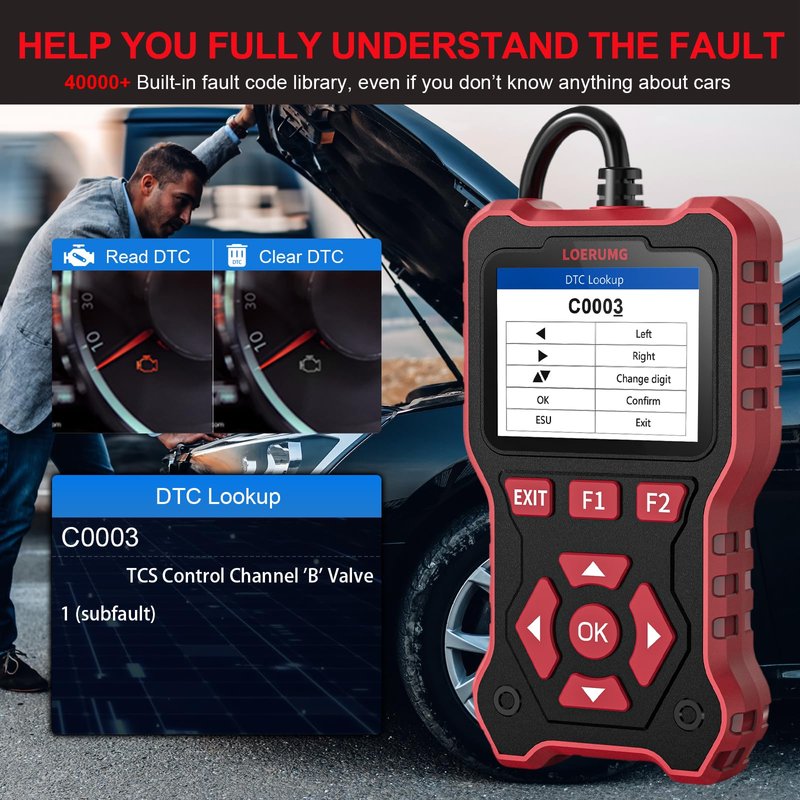- 【Complete OBDII Scanner Functions】 LOERUMG CZ003 professional automotive scanning diagnostic tool equipped with full OBDII modes can easily help you Read/Clear Fault Codes, Freeze Frames, Real-time Data Flow,On-Board Monitor Test/Mode 6, EVAP Test /Mode 8, Vehicle Information, Fuel Testing, Data Monitoring, Data Playback, DTC query (40000+), Turn off the check engine light, Battery voltage to obtain engine speed, to save your time and costly trip to a dealership as a better choose!