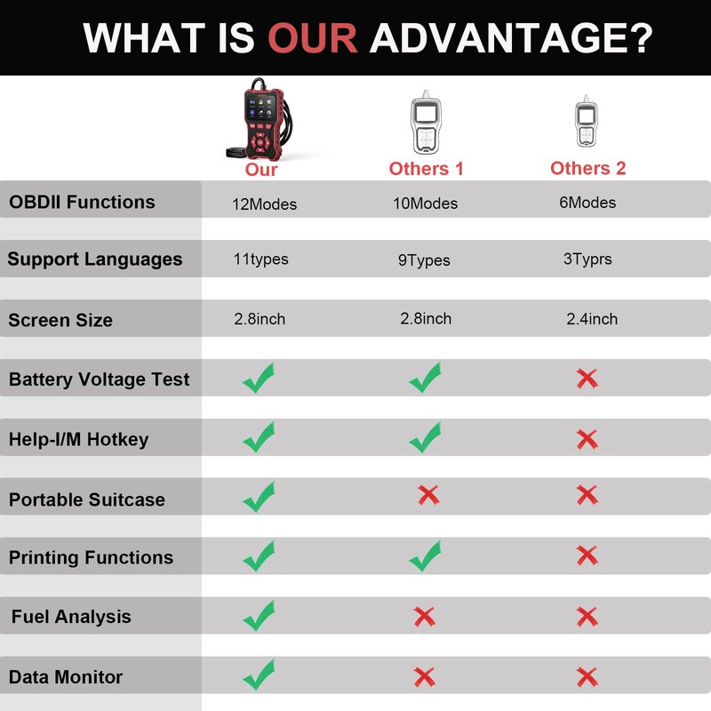- 【Advanced Design】 Adopts TPU soft rubber shell, which plays an anti-fall role, and comes with a portable suitcase; 2.8-inch color screen display and advanced UI interface design make reading easier and clearer; plug and play, Powered by car battery cells - no batteries or chargers required, safer and more portable; with free lifetime updates, you don't have to worry about out-of-date software even if you buy a new car.