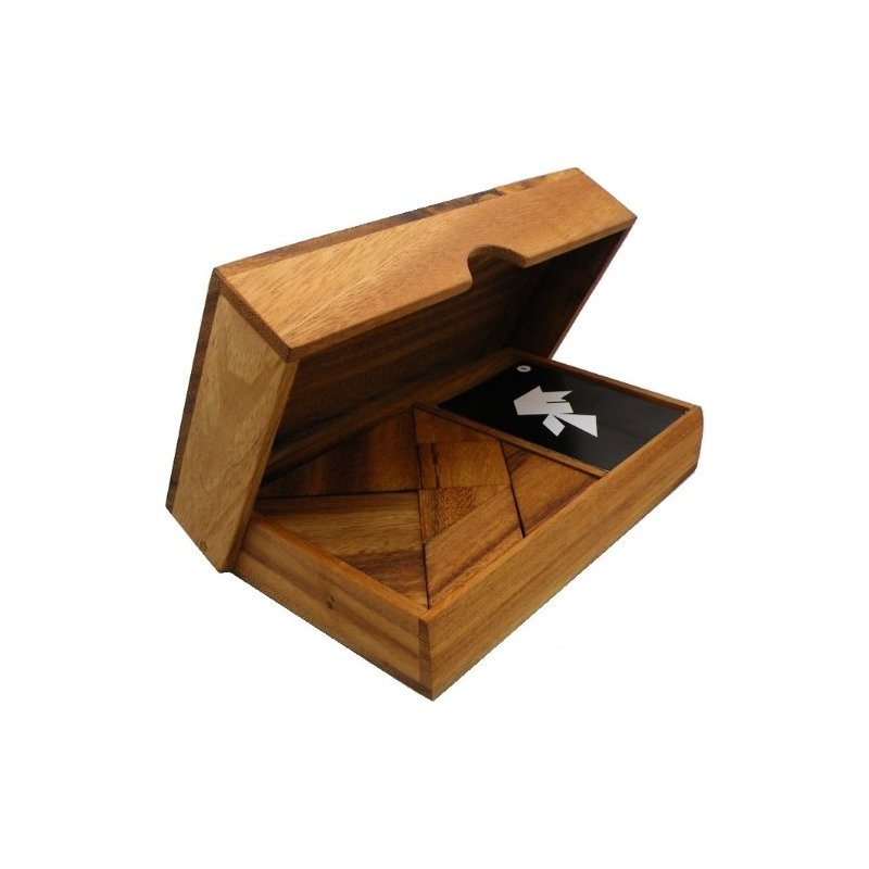 The Most famous and ancient brain teaser puzzle in the world. This puzzles has been called by many different names, such as '7 Tricky Pieces', '7 Clever Pieces', 'Chinese Puzzle' and many more, but the most common is 'Tangram'. The "Tangram" wooden puzzle challenges the puzzler to produce a given silhouette using all of the pieces. It can be tantalizingly difficult, but also satisfying when the pieces fall into place and even thrilling when you invent a new form. There are over 1000 different silhouettes you can do and enjoy hours of fun. We provide 64 different shape options for you to start with and you can find many more online. This great Tangram game set will give you, your family and friends hours of enjoyable playing. It comes complete with 2 sets of the 7 wooden pieces Tangram (Total of 14 playing wood pieces) and 43 glossy silhouette cards booklet. Each card showing on one side the silhouette you can try and build, and the solution on the other side. Since this game offer 2 sets of the 7 pieces Tangram, there is an option to use it as a 2 player game, when a silhouette card is pulled out, and each of the players try to complete the silhouette first, without looking at the solution. The puzzle comes with wooden box and matching lid, for safe keeping of the pieces and cards. Great gift for any puzzler that love challenge.
