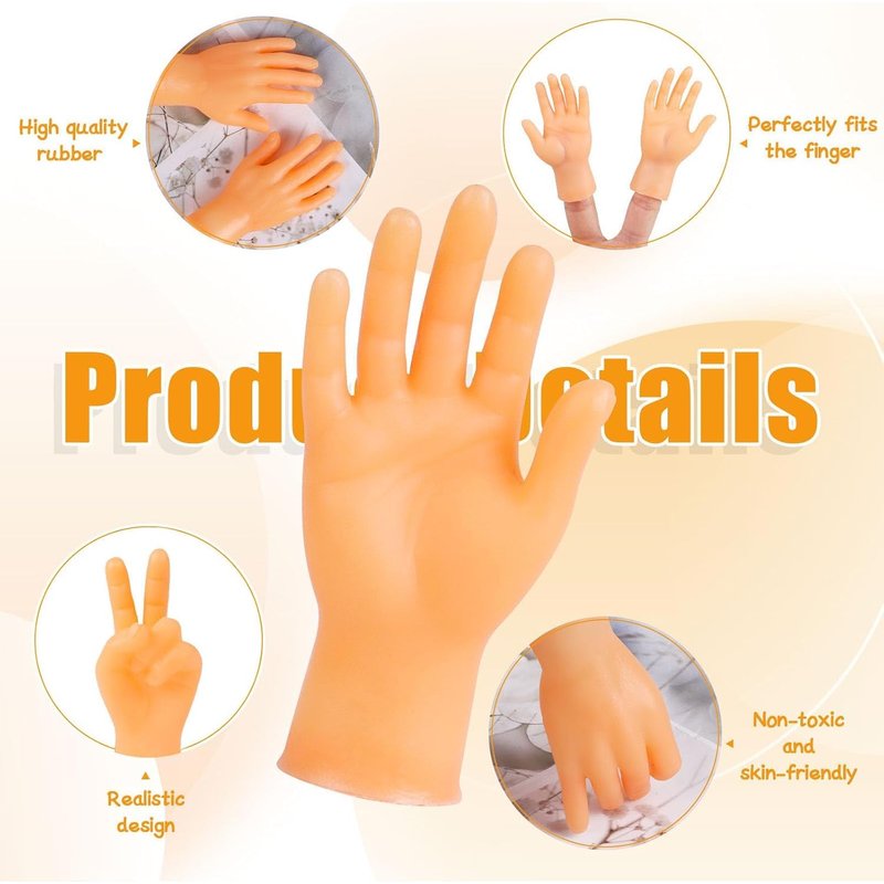 Little hands, big fun! Introducing our tiny finger hands, the perfect accessory for endless entertainment. These mini hands are designed to fit on your fingers, giving you the ability to create hilarious and adorable scenarios with just the flick of a wrist. Ideal for kids and adults alike, these hand finger puppets are sure to bring a smile to anyone's face. Whether you want to perform a silly puppet show, prank your friends, or simply add a touch of whimsy to your day, our tiny finger hands are the perfect addition to your toy collection. Made from durable and flexible materials, these small hands are built to last through hours of playtime without losing their shape or color.