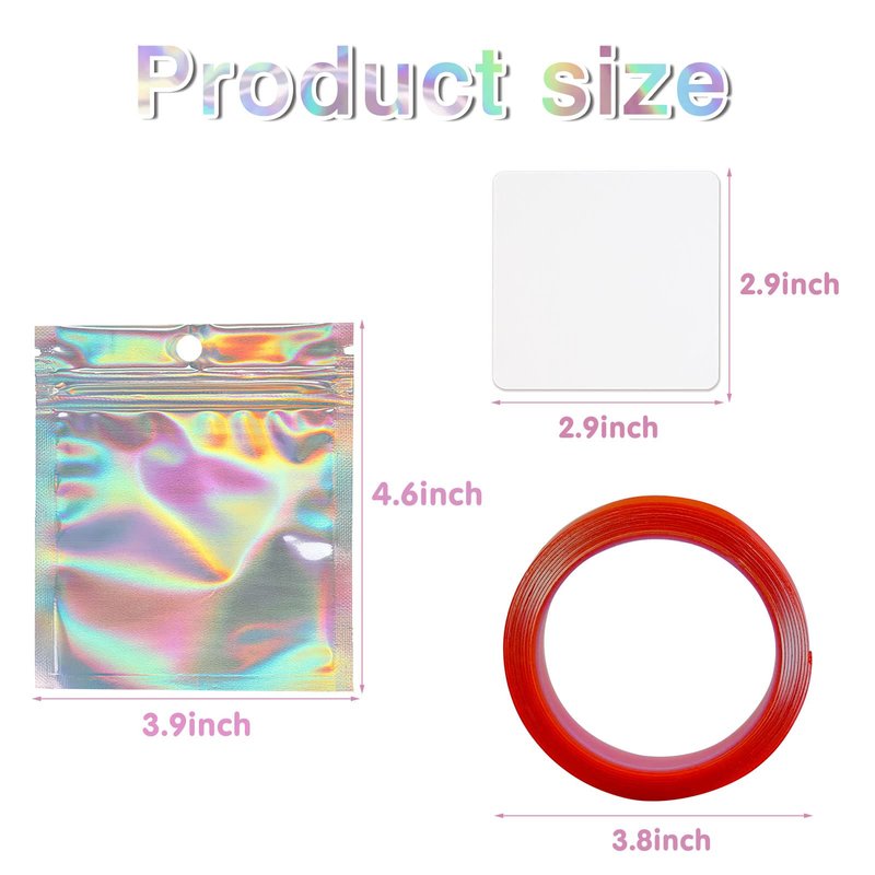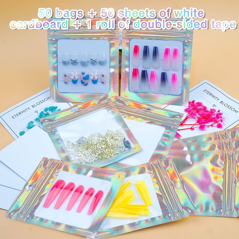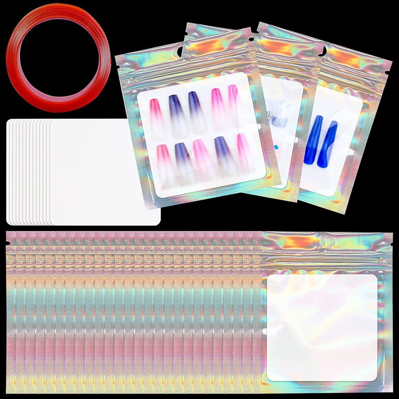 - Package Included: you will receive 50pcs holographic press on nail bag packaging, 50pcs white card boards and a roll double sided mounting tape, which will great for your handmade nail business.