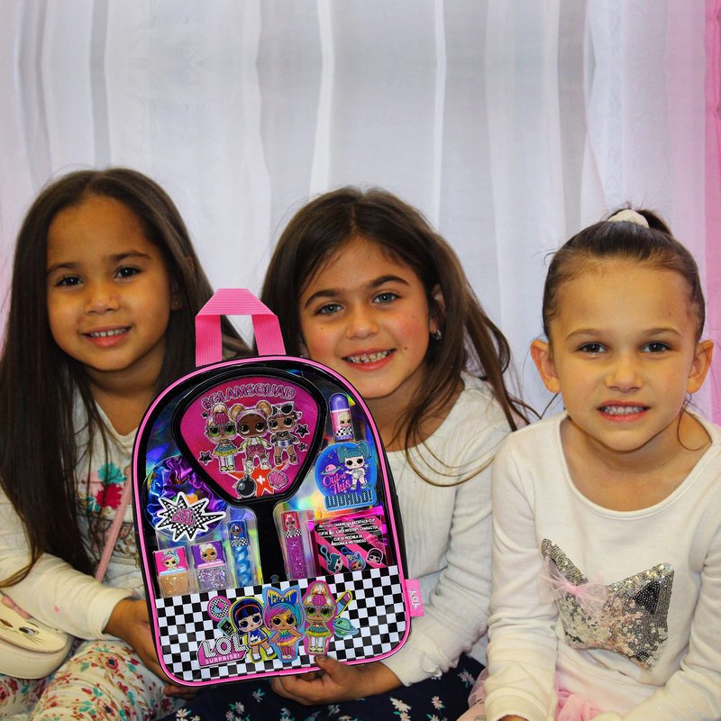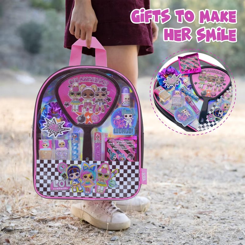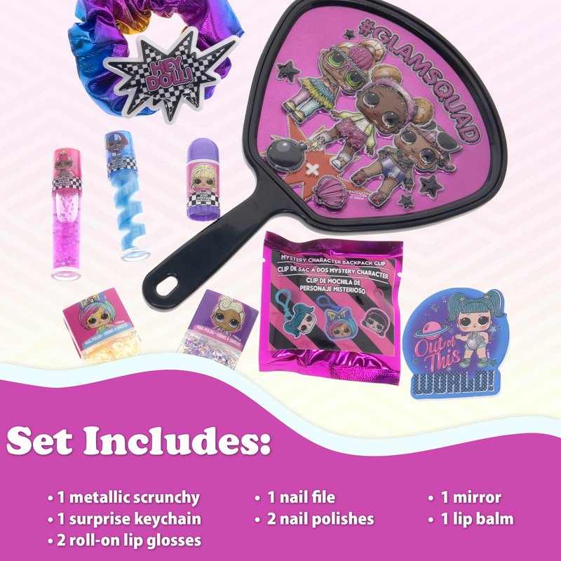 - UNLEASH HER CREATIVITY This amazing makeover set contains everything she will need to create a dazzling beauty look. With multiple polish colors and nail file, lip glosses and more, she'll have so much fun glamming up. And the best part is she can take all of these beauty essentials with her on the go by storing them in her new L.O.L. backpack!