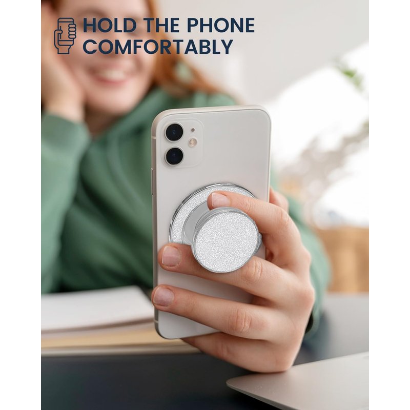 LOLLWIDY Glitter Phone Grip Compatible with MagSafe, Detachable Phone Grip Holder Collapsible, Compatible with Kindle, Smartphone Tablet Cell Phone Accessory (Magnetic Type, Silver)