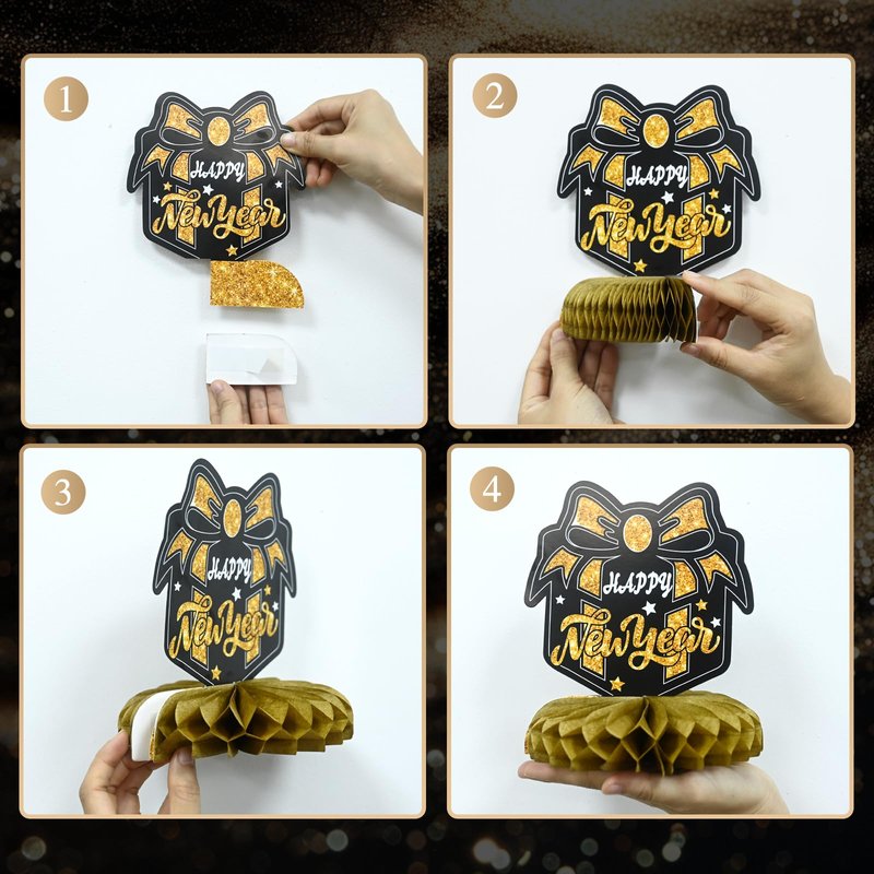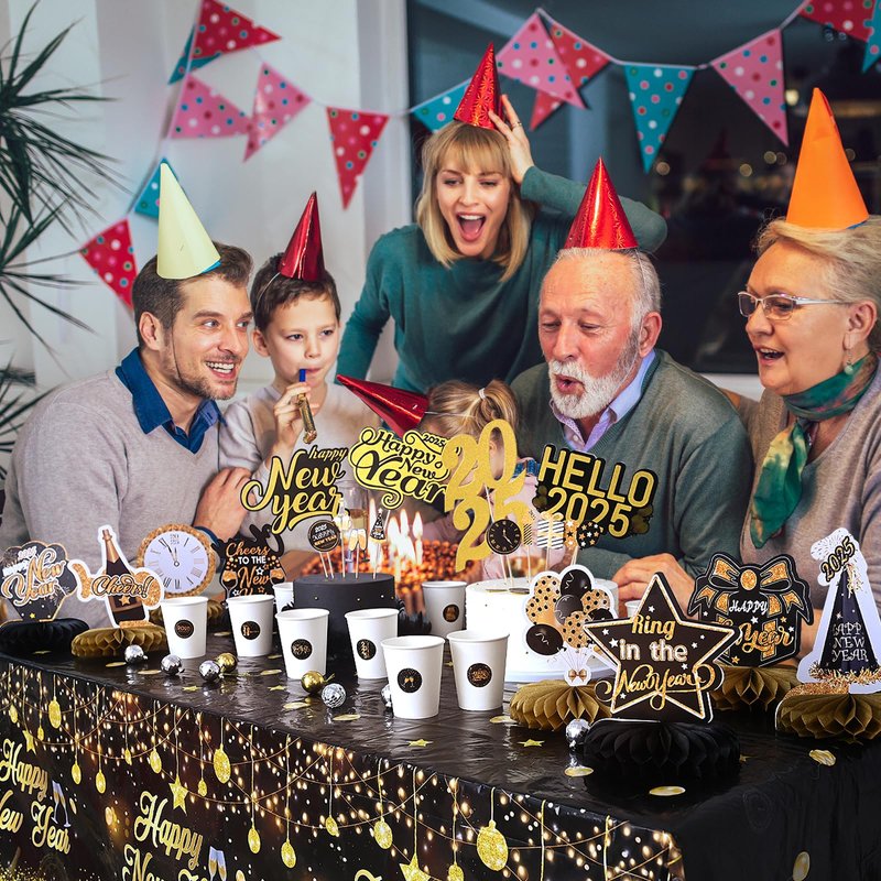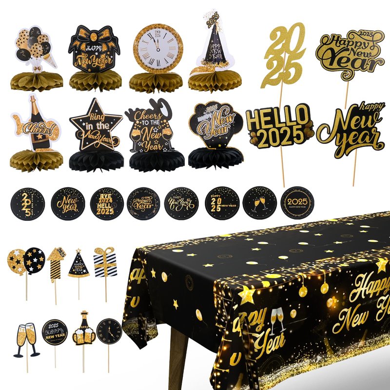 - 🎉 PACKAGE INCLUDES: You will get 8 honeycomb table centerpieces, 4 double-sided centerpiece sticks, 8 cupcake toppers, 24 stickers, and 1 tablecloth, customed for 2025 New Year's Eve party decorations, making your Happy New Year theme party more chic.