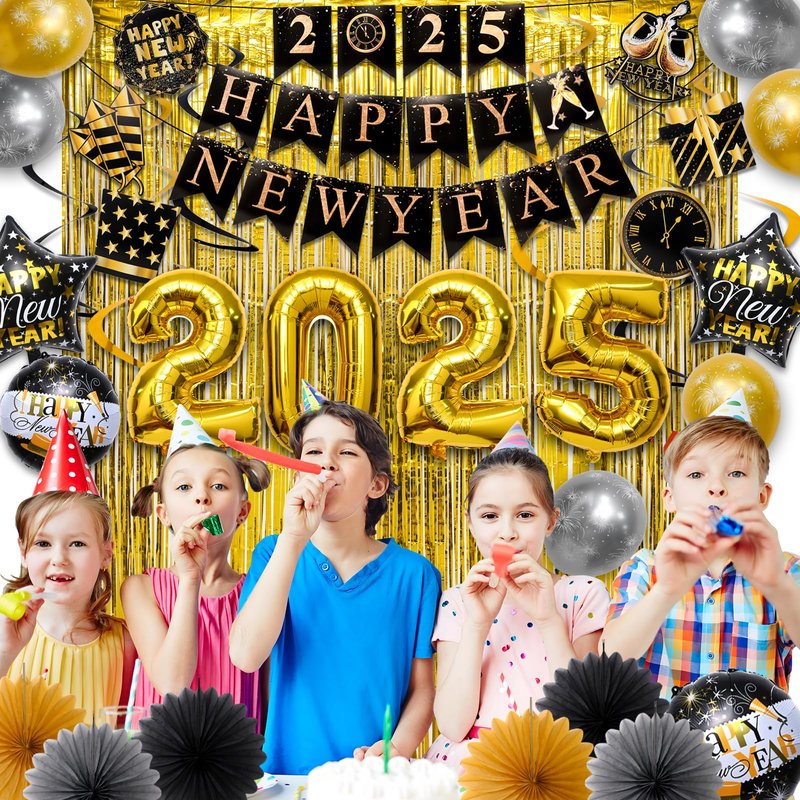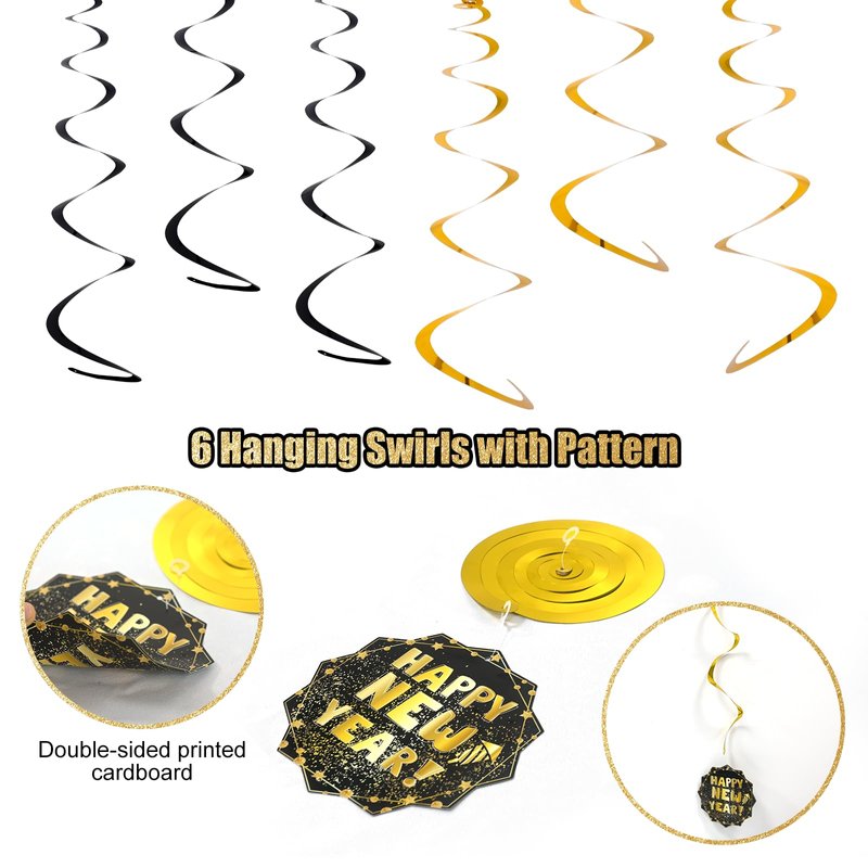 - Unforgettable Memory: Our product has enough styles and quantities of these balloons that you can use them to decorate your one-of-a-kind party. gold and black "HAPPY NEW YEAR" banners 、different color paper pompoms 、gold round New Year foil balloons、black star New Year foil balloons.