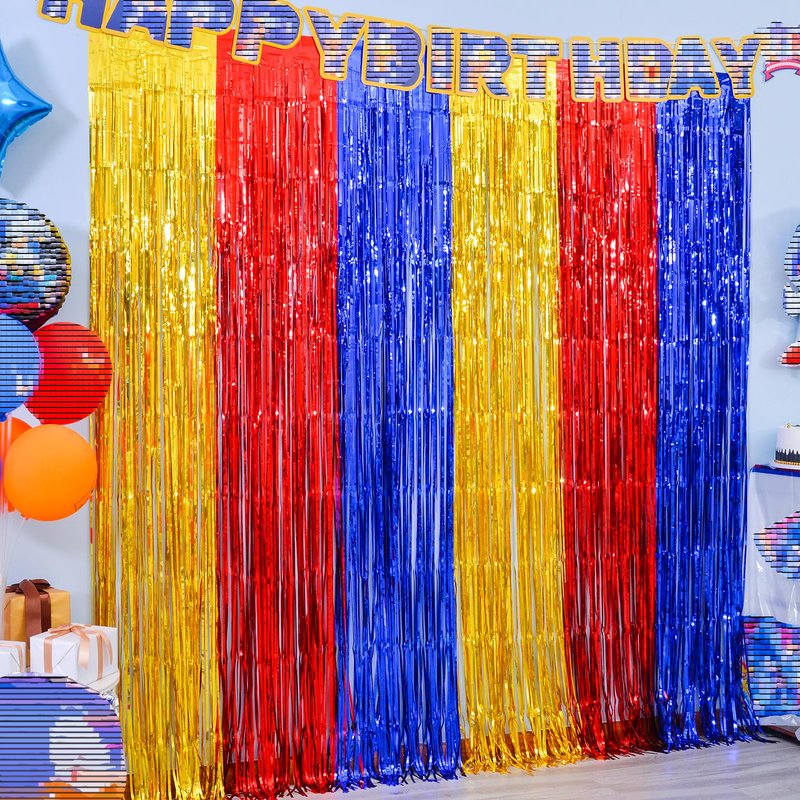 - 🐾 GOLD RED AND BLUE BIRTHDAY PARTY SUPPLIES: Our unique tinsel foil fringe curtains are the perfect photo backdrop for every gold red and blue party decoration and room decor. You will be amazed at the colorful atmosphere and view they create.