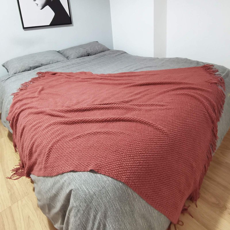 LOMAO Knitted Throw Blanket with Tassels Bubble Textured Soft Blanket Lightweight Throws for Couch Cover Home Decor (Red Mud, 50x60)