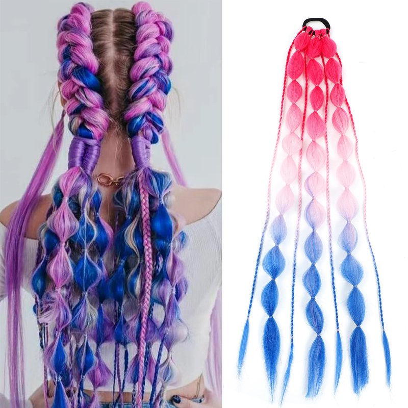 Long Braided Bubble Colored Hair Extensions, 25 Inches Bubble Kinky Rave Straight Ombre Lantern Braid Extension with Hair Tie Hairpieces for Girls Daily Wear