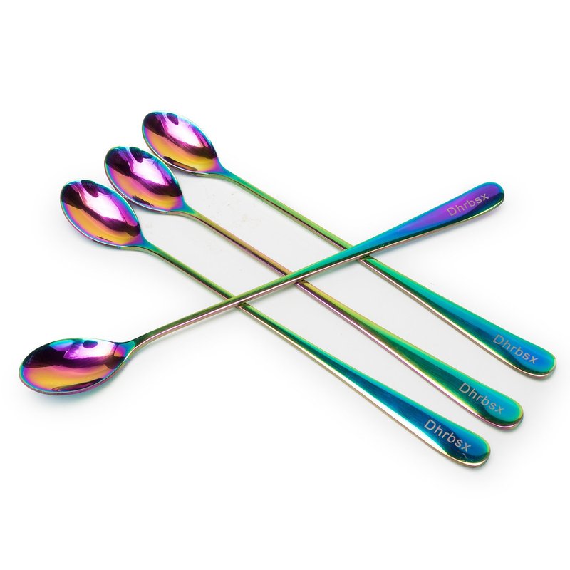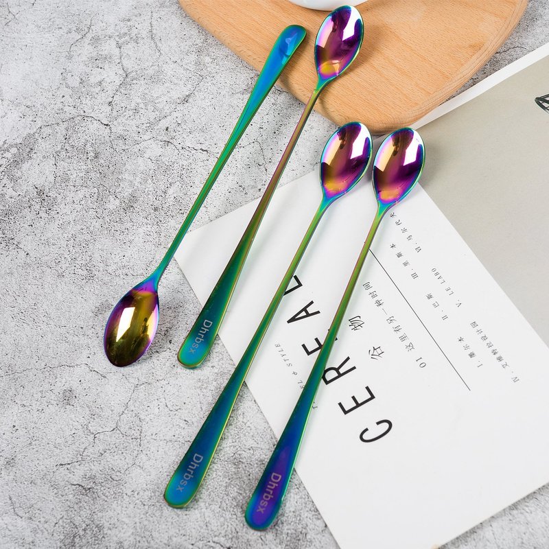 Long-handled ice tea spoon, cocktail stir spoons, stainless steel coffee spoons, Colored ice cream scoop (9 IN iridescence, Round)