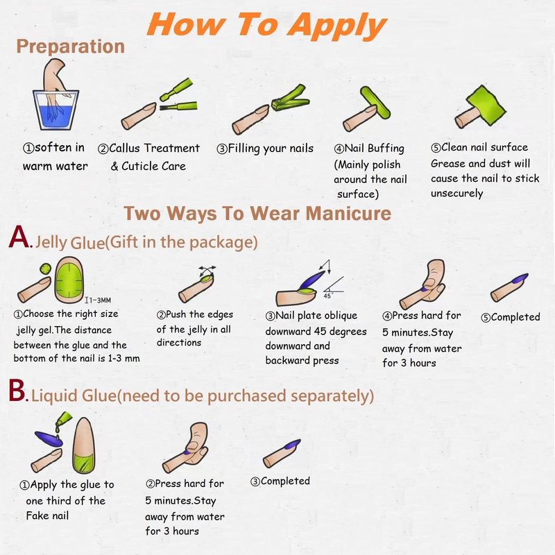 - 【Lasting Effect】: You can use the nail glue sticker we give away ( use nail glue sticker, fake nails can be reused ), but the nail glue sticker is not as good as liquid glue, if you want to last longer, please use liquid glue, the effect can last 1 to 2 weeks.