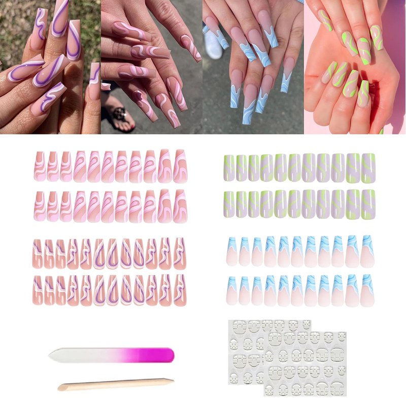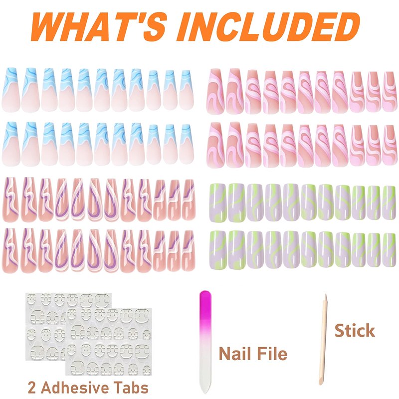 - 【Package Includes】: 4 Packs of different styles Matte Coffin press on nails medium(96pcs) in one pack, divided into different sizes, you will definitely find a fake nail that fits your nail size. 2 sheets of jelly gum,a nail file and a small wooden stick are also included with the package. No need to buy other things, you can get the nail salon-like effect.