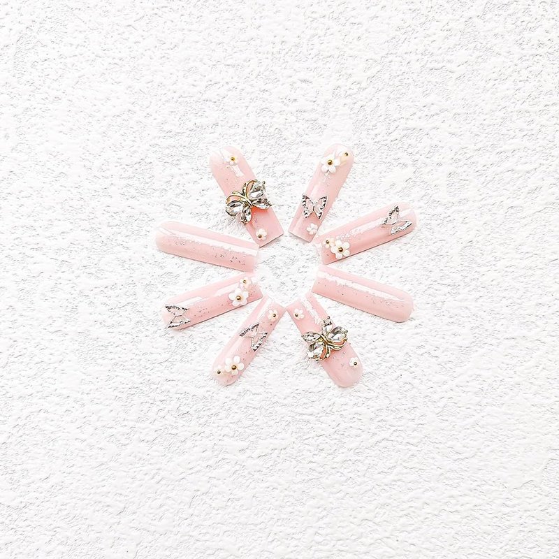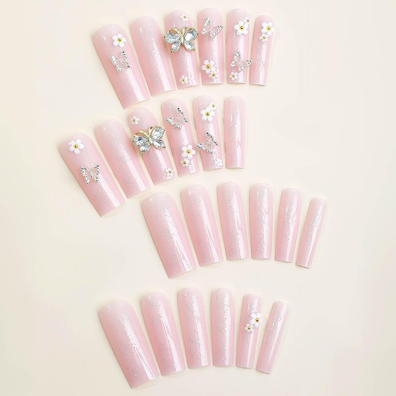Long Press on Nails Coffin Fake Nails Pink Acrylic Nails with Flower Rhinestones And Silver Butterfly Designs False Nails Full Cover Stick on Nails Glitter Artificial Nails Manicure for Women 24Pcs