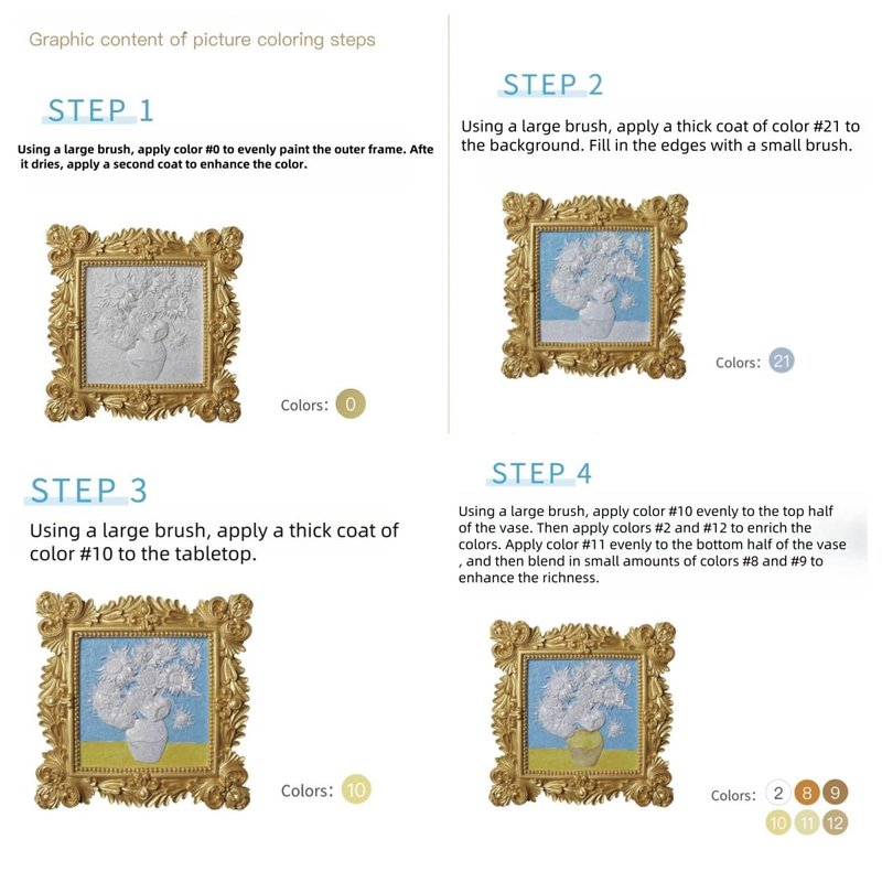 Product Description: Explore your artistic side with our Van Gogh Inspired 3D DIY Paint Kit. This kit is designed for both adults and kids, offering an immersive and enjoyable painting experience. The kit includes a 3D canvas replicating Van Gogh’s "Sunflowers," along with a stunning gold frame to showcase your finished masterpiece. With 13 vibrant paints, a palette for mixing, and three different brushes, you have everything you need to bring your art to life. Our easy-to-follow instructional video ensures that even beginners can create beautiful art pieces with confidence. Crafted from premium, eco-friendly materials, our paint kit guarantees a high-quality painting experience with colors that remain vibrant over time. This DIY paint set is perfect for art lovers, making it a thoughtful gift for friends and family, or an exquisite addition to your own home decor.