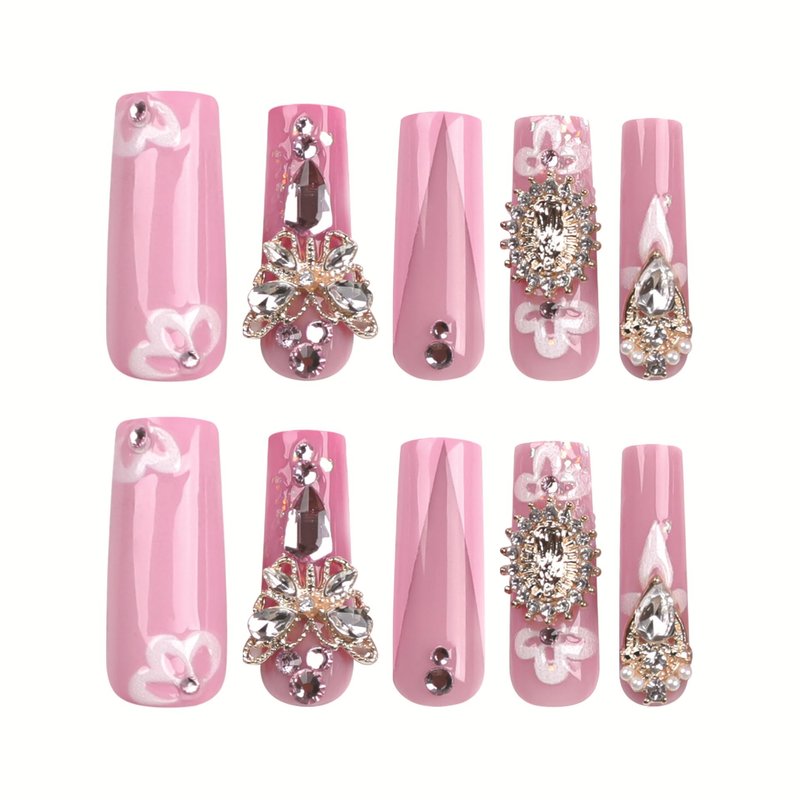 Long Square Press on Nails RTKHFZE French Fake Nails with Rhinestones Designs Artificial Nails Flower and Butterfly Press on Nails Pink Full Cover Acrylic Nails Stick on Nails for Women Manicure