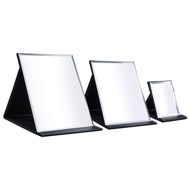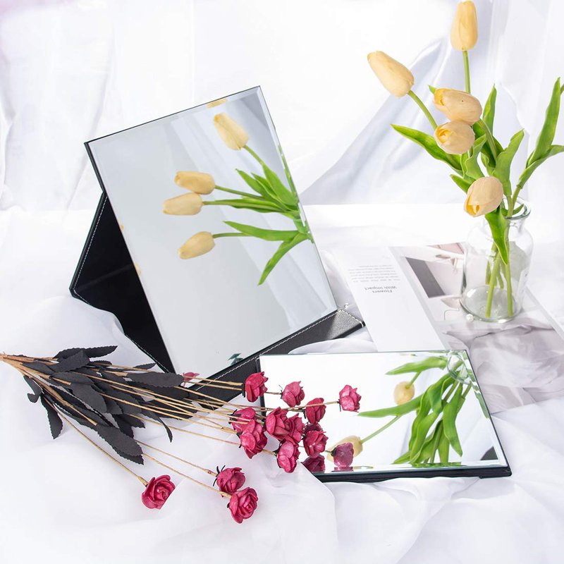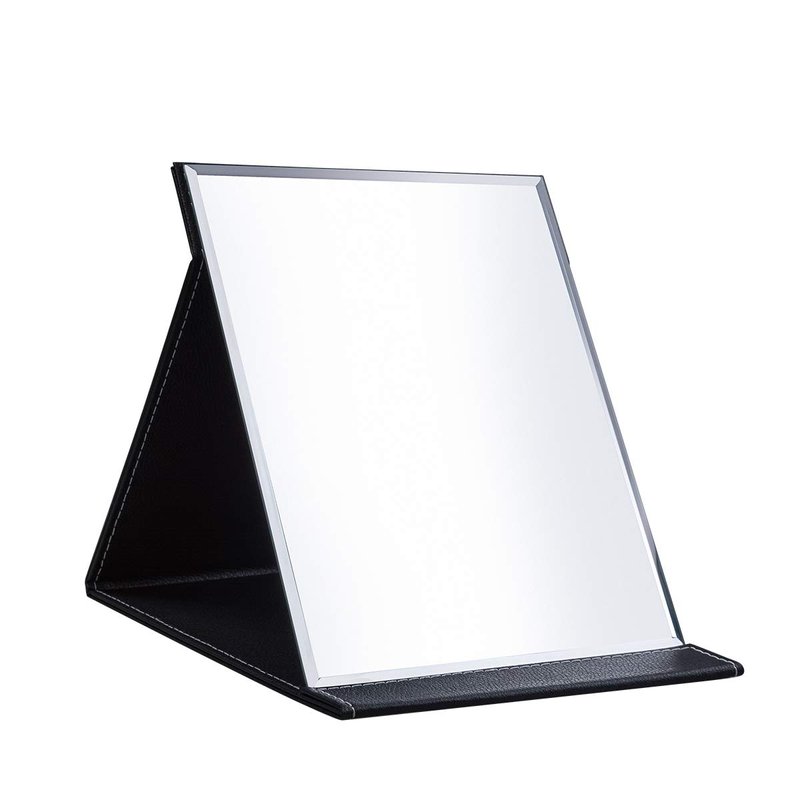 LONGSHENG - SINCE 2001 - Protable PU Leather Mirror Folding Desktop Makeup Mirror with Adjustable Stand for Personal Use,Travelling (L, Black)